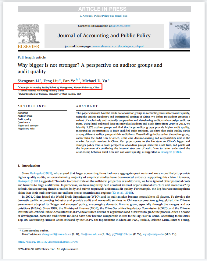 In June, 2023, Professor Liu Feng, Director of Accounting Development Research Center of Xiamen University/Department of Accounting of School of Management, and his team Li Shengnan, Assistant Professor of Accounting Development Research Center of Xiamen University/Department of Accounting of School of Management (the first author), Dr. Ye Fan, Lecturer of Xiamen National Accounting Institute, and Professor Yu Dong of Richard Business School of the University of West Georgia, USA collaborated on the topic "Why bigger is not stronger? A perspective on auditor groups and audit quality",published online in Journal of Accounting and Public Policy.
