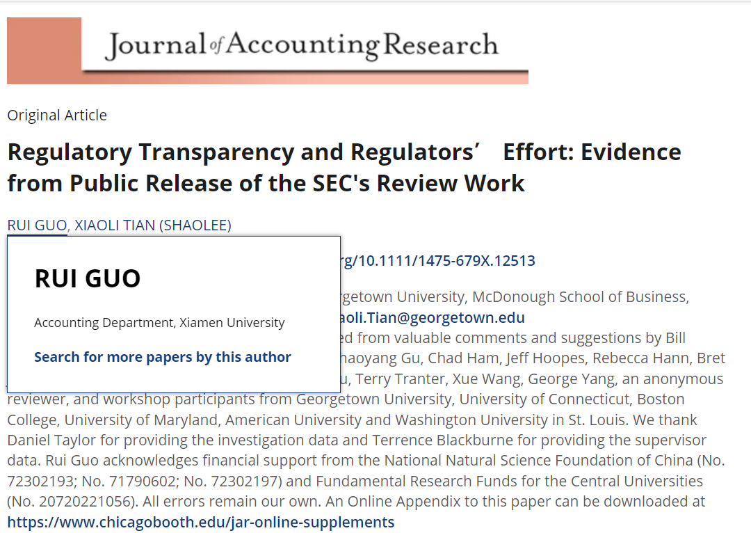 On October 12, 2023, the paper of assistant professor, Rui Guo from Accounting Department of School of Management, Xiamen Univerity, Regulatory Transparency and Regulators’ Effort: Evidence from Public Release of the SEC's Review Work, (co-author is prof. Xiaoli Tian) was published on the Journal of Accounting Research, which is one of Top 3 global accounting journals.