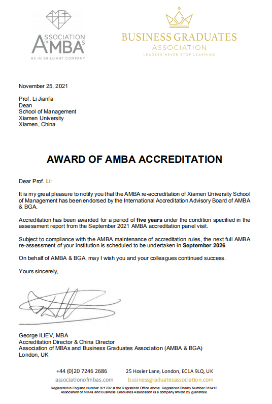 After appropriate decision periods, the AMBA and EQUIS Boards announced that the School of Management, Xiamen University was re-accredited for another five years in November 2021 and March 2022 respectively. Successful re-accreditations confirm SMXMU’s exceptional quality of students, faculty and programs, and lend weight to the school’s strategic choices. SMXMU is very proud of the achievements and at the same time aware of the responsibilities these re-accreditations confer on us in terms of continuous improvement and academic quality. SMXMU will continue to hold on to the high standards of world-class internationalized business schools as self-requirements, and devote every effort to pursue excellence in all fields unceasingly.