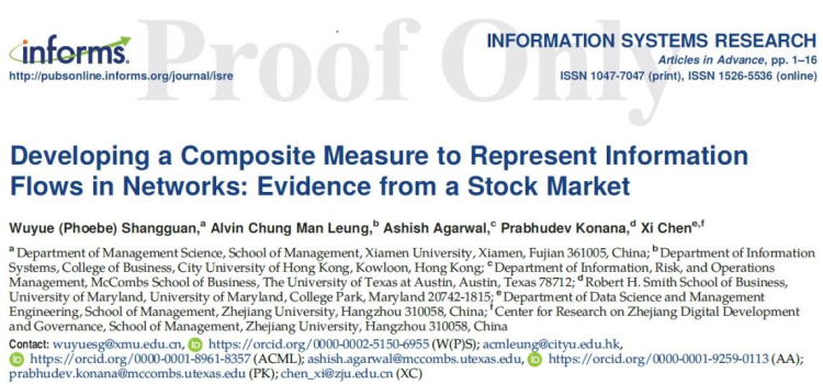 Shangguan Wuyue postdoctoral joined the postdoctoral station of management science and engineering of Xiamen University in August 2020. On August 12, 2021, the academic paper "Developing a Composite Measure to Represent Information Flows in Networks: Evidence from a Stock Market" signed by Shangguan Wuyue postdoctoral was officially accepted by the international top journal Information Systems Research, which will become the first article published by the school of management in this journal. Information Systems Research is one of the top 24 academic journals (UTD24) selected by the University of Texas, Dallas. Information Systems Research is a top journal in the field of international information systems and enjoys a high academic reputation in the field of international management.