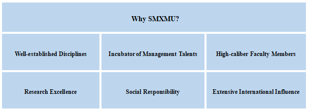 After rapid development during past century, SMXMU now consists of 6 academic departments, 7 Research Institutes and Centres, 4 Education Centres, 8 Functional Offices and 3 Functional Committees. It offers 8 disciplinary doctoral degree programs (8 PhD degree programs of specialist subjects), 8 disciplinary master degree programs (8 master’s degree programs of specialist subjects), and 3 disciplinary bachelor degree program (9 bachelor degree programs of specialist subjects). The School provides 5 professional Master’s degree programs including MBA, EMBA, ME, MTA, MPAcc. Since 2013, according to China Discipline Rankings (CDR), Business Administration has been ranked top5 in China. In 2017’s China Discipline Rankings (CDR), SMXMU received an A in the category of Business Administration and B of Management Science & Engineering. In 2019, Economics and Business ranked among the world’s top 1% by ESI. The Ministry of Education has announced the list of national first-class undergraduate courses construction sites. Among those approved sites are 7 majors from SMXMU: Business Administration, Accounting, Financial Management, E-commerce, Human Resource Management, Management Science and Tourism Management.