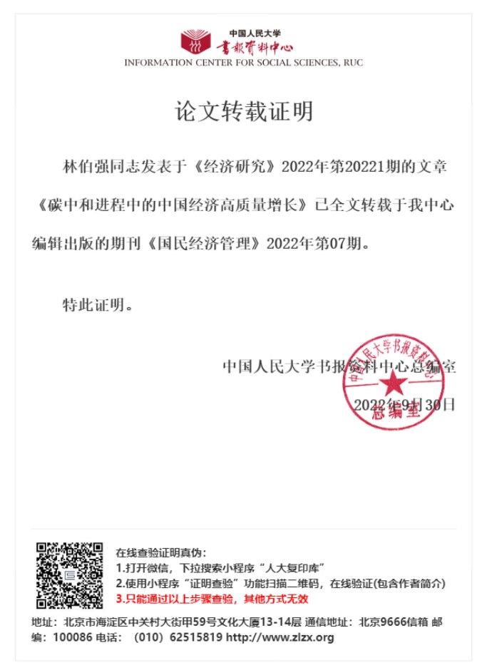 近日,《中国社会科学文摘》2022年第8期转载了我校管理学院林伯强教授的文章《碳中和进程中的中国经济高质量增长》,此前《新华文摘》2022年第12期、《人大复印报刊资料》的《国民经济管理》2022年第7期全文转载了该文章。该文原发表于2022年第1期《经济研究》,为国家自然科学基金重点项目的阶段性研究成果。