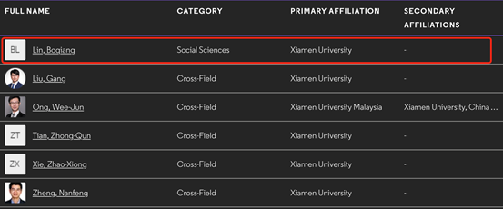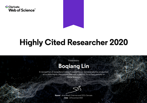 2020年11月,权威引用数据分析机构科睿唯安(Clarivate Analytics)公布了2020年度高被引科学家(Highly Cited Researcher)名单。厦门大学管理学院中国能源政策研究院院长、能源经济与能源政策协同创新主任林伯强教授入选社会科学(Social Sciences)领域高被引科学家。据悉,此次全球共遴选出6167位高被引科学家,中国内地共有770位学者入选。厦门大学(包括马来西亚分校)此次共有6位学者入选,林伯强教授是唯一一位文科机构入选学者。