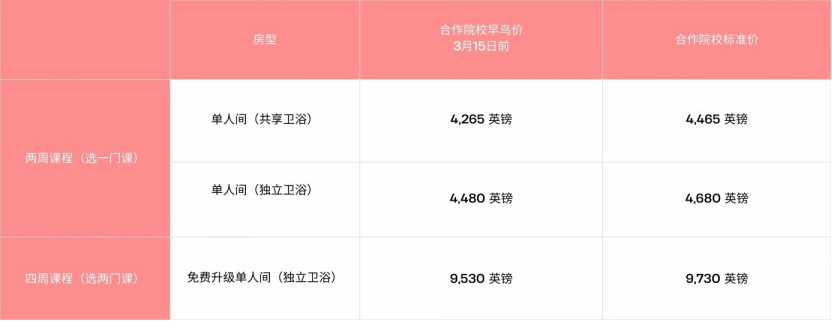 本项目面向我校在读学生提供专项学费减免900英镑的支持政策。于3月15日前完成官网申请的学员,可在上述优惠基础上额外享受200英镑早鸟申请减免,并在住宿房型选择上享有优先权。