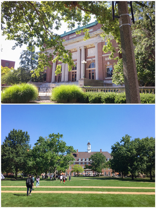 当天晚上我们就抵达了UIUC,它位于幽静的Urbana-Champaign,说起来这还是一座双子城,而分界线就位于我们上课的Gregory hall外面的Wright Street,所以每当我们过马路上课时却不知不觉到了另一个城市。对两座小城最深的印象是安静祥和,可能是暑期的原因,路上的行人和车辆很少,但人与人之间却特别友好,过马路时车都会主动停下等人先行,每天乘公交时司机都会热情的打招呼,买东西结账和走出商场都会有人跟你说Good Day,甚至某次刚下公交的我迎面对上一个路人的视线,他还笑笑对我说Morning,这种友好的氛围非常有感染力,不经意间心情都会变好,日常变得放松和愉快。有趣的是,校园里的松鼠和兔子出镜率非常高,有的松鼠会比较怕人,但如果你拿着吃的它就会暴露吃货本性,还有的兔子懂节拍,会随着鼓掌声音一跳一跳的,非常可爱,但想拍到它们并不容易,行动速度超级快,图片上是在白宫外面遇到的一只不怕人的松鼠。香槟的天气很好,每天出门都有暖暖的阳光和澄澈的天空,空气很干净,昼夜的温差大像极了我的家乡,所以还是很宜居。第二天我们参观了校园,各色各样的建筑非常有美式风情,红砖石柱,据说清华的设计就是很大程度上借鉴了UIUC的风格。主楼和学生活动中心前的草坪令人心生向往,适合学习、运动还有娱乐和休息。