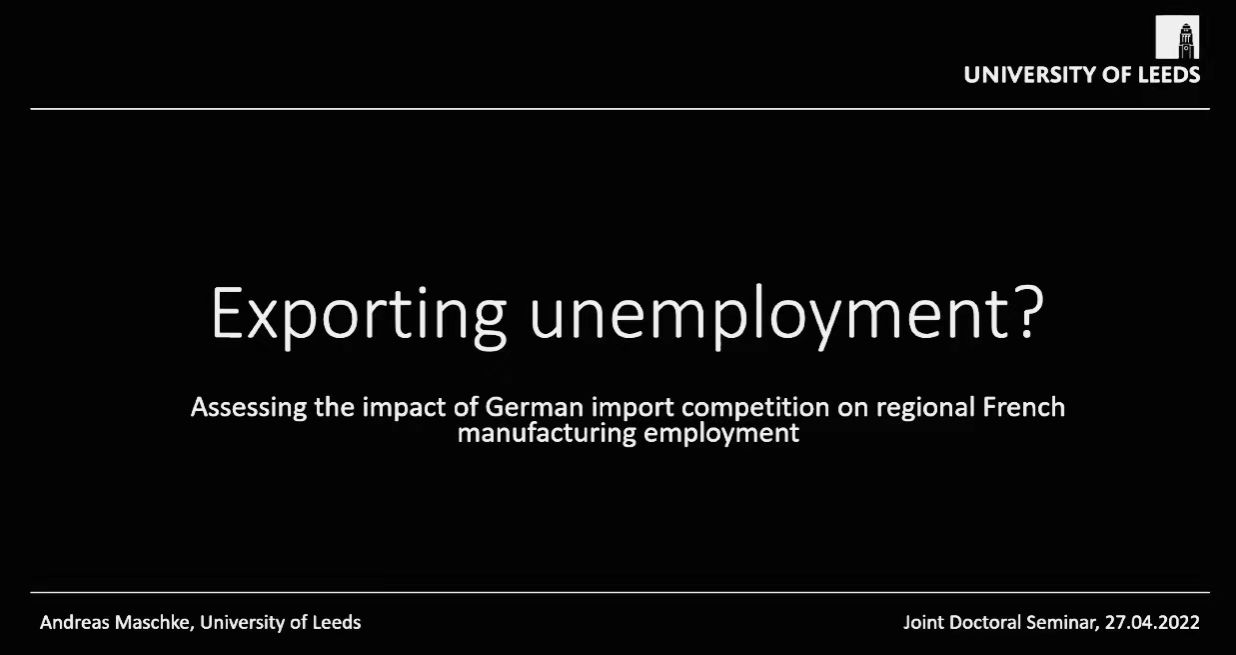 利兹大学商学院的Andreas Maschke博士展示了Exporting Unemployment? Assessing the impact of German import competition on regional manufacturing employment in France的论文。该研究该课题主要评估德国进口竞争力对法国地区制造业就业的影响,是否输出失业?关注德国在过去二十年里稳健不乏的贸易实力,即便在全球金融危机及新冠肺炎疫情全球大流行的背景之下依然是世界出口巨头。该文旨在探究德国经常账户盈余与欧元区财政和结构性危机的联系。该研究采用了一种曝光设计方法进行研究,该设计通过法国各省区域制造业专业化的差异,结合工具变量策略等,捕捉德国进口竞争力对法国制造业就业的影响。