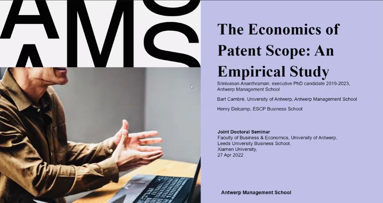 安特卫普大学工商管理学院的Srinivasan Ananthraman博士分享了The economics of patent scope: An empirical investigation为题的论文。专利范围是讨论创新和专利政策的一个要点,其最优性是平衡专利权在激励创新和传播技术知识以造福社会方面作用的关键因素。该研究通过识别专利权要求中特定且常用的开放式范围术语来解释专利范围有效、稳定和互补的衡量标准,使专利管理人员受益。研究发现,创新者在专利中使用这些与范围相关的术语,在专利申请阶段和专利审查期间策略性地扩大专利范围,而审查员通常通过减少独立要求的数量或增加专利中的字数来缩小范围。