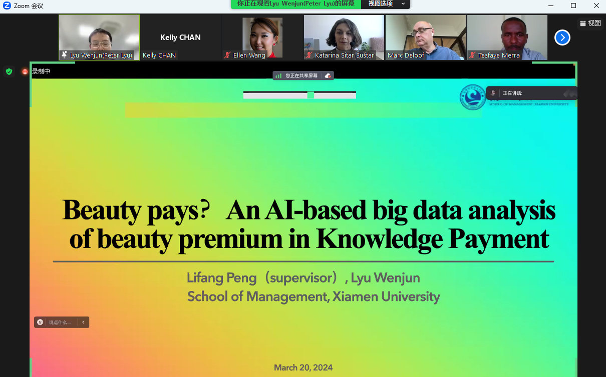 厦门大学管理学院博士生吕闻君以Beauty Pays? An AI-Based Big Data Analysis of Beauty Premium in Knowledge Payment为题进行了汇报分享,该研究对互联网知识付费领域的颜值溢价现象展开了研究。他从“爱美之心人皆有之”的角度阐述了颜值溢价(即“倾向于美丽的选择”)在社会生活中的普遍存在,并引用晕轮效应对此现象进行了解释。以往关于颜值溢价的研究并不鲜见,但研究方法存在局限,且对服务场景缺乏关注。而基于AI技术对个人面部外貌进行识别,并利用大数据对服务场景下的颜值溢价进行分析,能够有效改善以往研究外部性不足、样本量少等问题,对新的情境展开验证。研究发现,在知识付费领域,颜值高的服务提供者能够获得更多数量的客户以及更高分的评价,且这种颜值溢价效应在女性、年轻的服务提供者中更为突出。这项研究是在服务,特别是知识付费领域进行AI面部分析的首批研究,为在线服务提供商形象管理以及数字营销提供了见解。