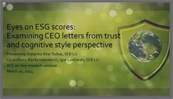 卢布尔雅那大学经济与商业学院博士生Katarina Sitar Sustar汇报的题目是Eyes on ESG scores: Examining CEO letters from trust and cognitive style perspectives,探究了读者对于来自公司CEO信件中ESG有关内容的信任和认知。针对过往研究中的空白,这项研究希望探讨:公司CEO信件中的ESG表现是否与ESG评分机构的评级一致,读者的信任和认知风格是否影响其阅读公司CEO信件后对公司ESG表现的评估,读者评估公司ESG表现时关注CEO信件的哪些部分。这项研究采用了350家公司的CEO信件作为实验研究材料,邀请读者阅读并评估公司ESG表现,同时运用眼动仪对阅读过程进行录制,此外还使用问卷测量读者的信任和认知风格。这项探索性研究的成果值得评分机构、监管机构、投资者等群体的关注,并为基于读者个人特征的信件沟通有效性提供新的见解。未来,课题还将从ESG评级专家的个人特征、国家或个人层面的信任水平等角度开展关于ESG评估的进一步研究。