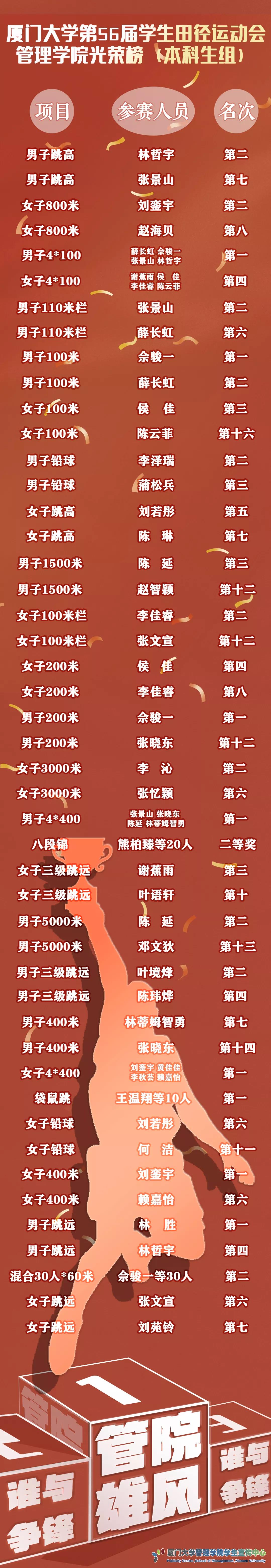 11月7日上午,厦门大学第56届学生田径运动会、第20届教职工运动会在思明校区演武场圆满闭幕。本次运动会中,我院师生坚守信念,挥洒汗水,最终获得本科生团体总分第一,研究生团体总分第三,学生运动会团体总分第二,教职工团体总分第五,学生、教职工体育道德风尚奖,健身气功(学生八段锦)二等奖的好成绩,再续往日荣耀,又添崭新光采,真正用砥砺自我书写了峥嵘岁月,更为管理学院铺就了又一个流金孟月。