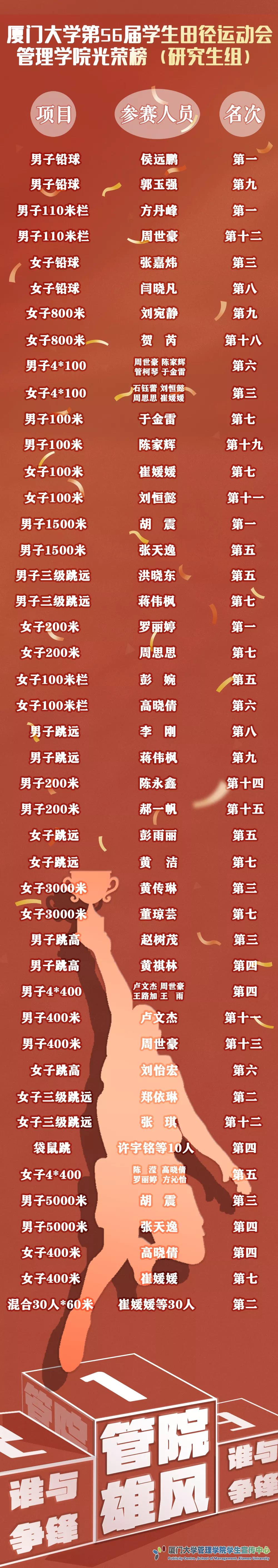 功成之绩,你我俱在。这些金色的荣耀,源于每位运动员不懈的努力和勇敢的突破,源于每位志愿者无私的奉献和细致的照顾,源于工作人员周密的安排和有序的组织,当然也源于每位普通的你我,我们在背后以欢呼和掌声相赠,让场上健儿们犹有所待,不惧回首。一日功成,一朝荣耀,是管院千人相守并进的硕果。