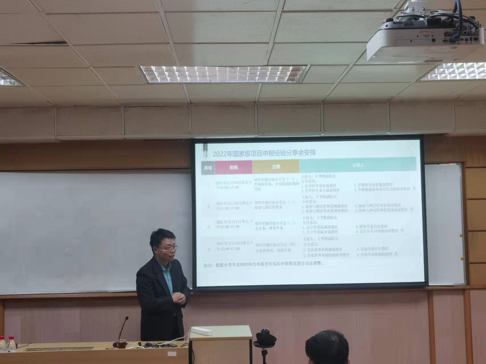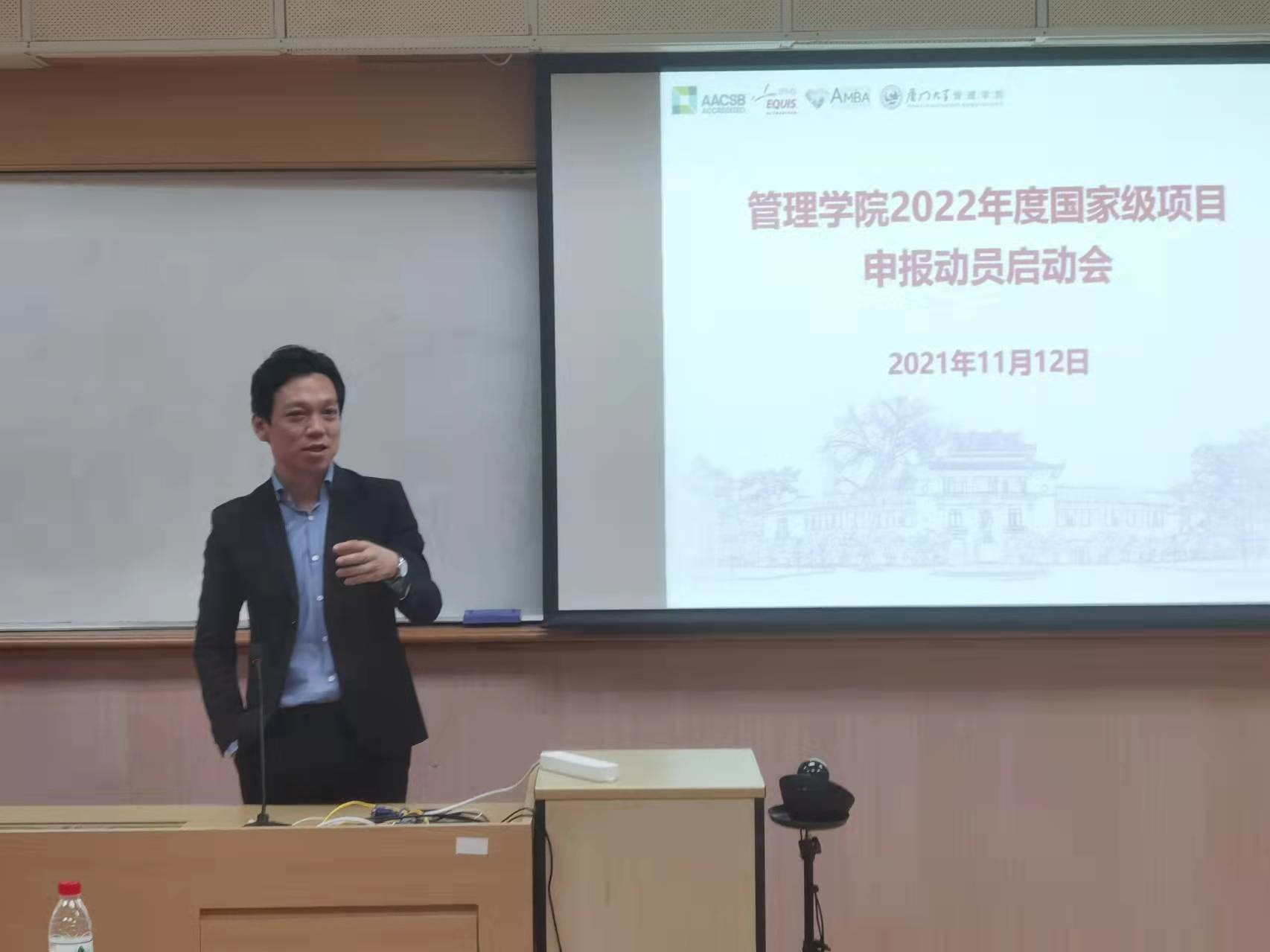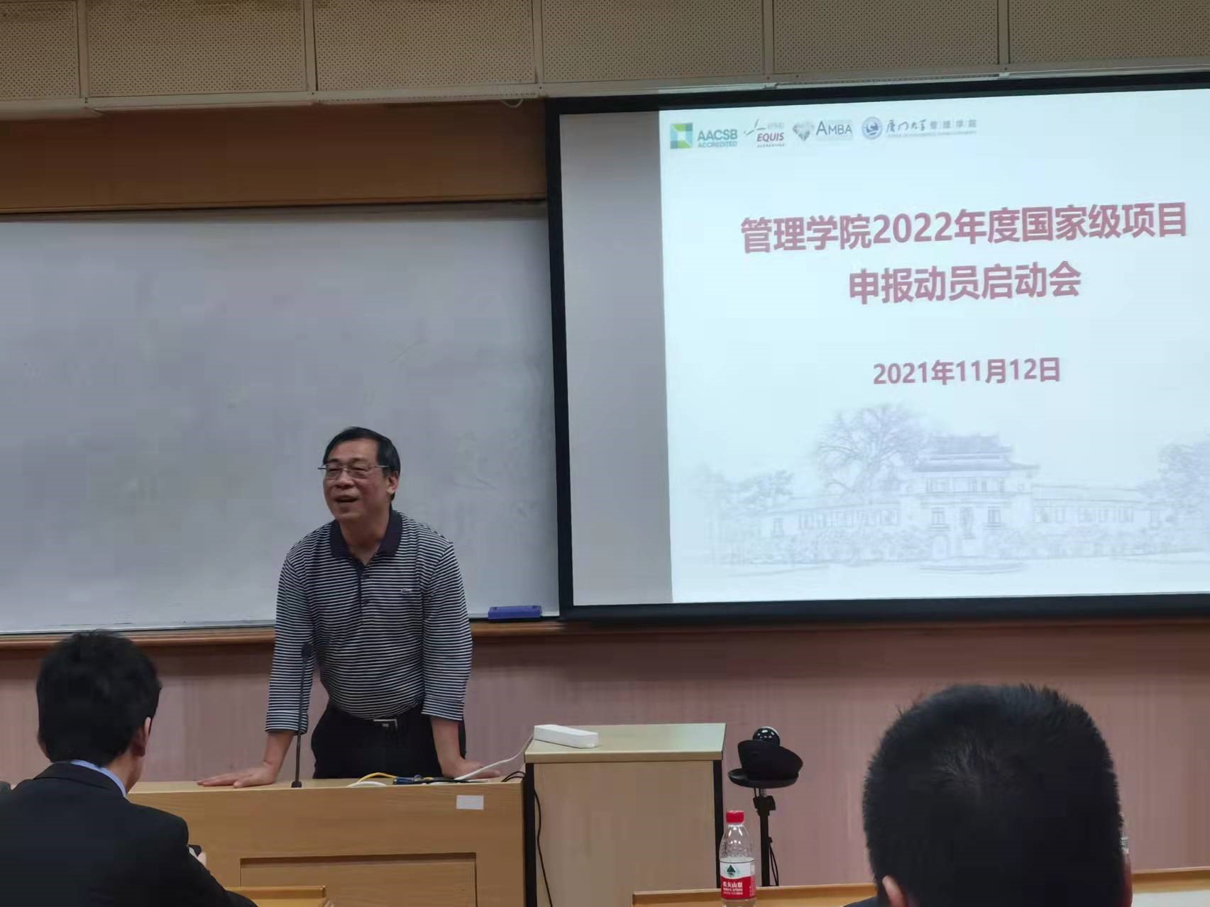 会上,管理学院院长李建发教授对2022年度国家级项目申请进行了动员讲话,他强调了国家基金项目对申请人、学科发展及整个学校的重要性,对我院国家基金项目申请人在申请书的准备撰写、修改完善等方面提出了殷切的希望,鼓励大家努力凝练研究方向、抓住前沿和国家重大需求,发扬艰苦奋斗、持之以恒的精神,建议大家提早准备、认真思考、反复打磨、不断提高申请书质量,并预祝我校2022年度国家基金项目取得更好的成绩。