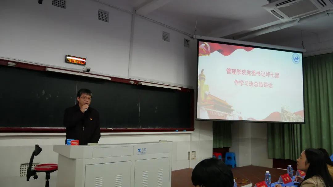 接着,党委书记邱七星书记作学习班总结讲话。他对本次党校的教学效果给予了肯定,同时也对大家寄予了很高的期望。首先,他强调学员们应不断端正入党动机,将正确的入党动机厚植于日常生活和工作中,纯洁自己的入党初心,全心全意为人民服务,这是做合格党员的起点。其次,他呼吁同学们要以更加求真务实的态度加强对党史的学习,把对党史的学习融入日常学习的一部分,常学常新,在党史学习教育中“明理、增信、崇德、立行”,努力成为信念过硬、政治过硬、责任过硬、能力过硬、作风过硬的新时代学生党员。最后,他希望同学们脚踏实地、勇于担当,用实际行动诠释对党的忠诚和服务人民,时刻按照党员标准,行动自觉、坚定信仰、不忘初心使命,起而行之、勇挑重担,为实现第二个百年奋斗目标、实现中华民族伟大复兴的中国梦而不懈奋斗。