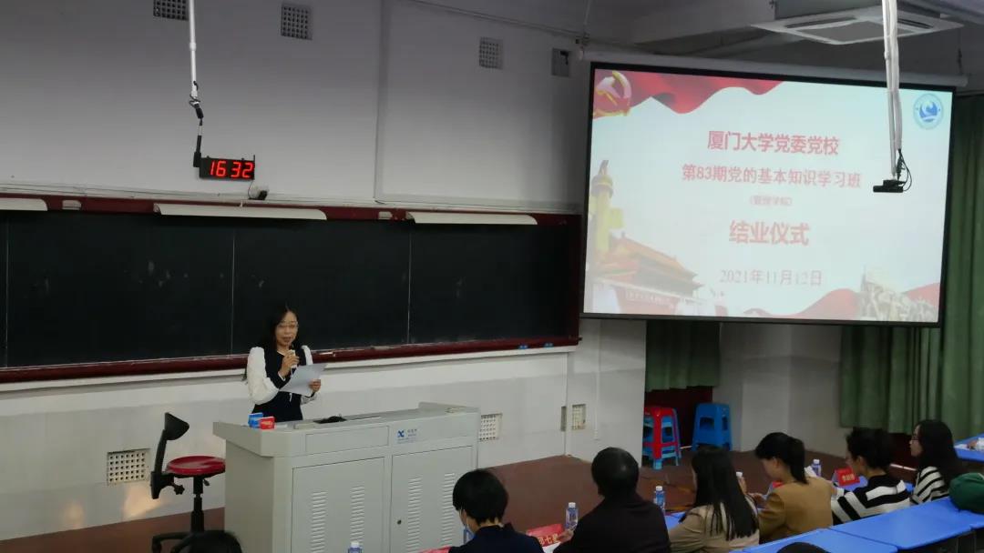 在学院党委的高度重视、亲切指导下,在各位任课教师、带队老师和全体学员的共同努力下,为期一个月的厦门大学党委党校第83期(学生)党的基本知识学习班(管理学院)已圆满结束,本期共有115名学员顺利结业。2021年11月12日下午,管理学院在群贤二105顺利举行学习班结业式。管理学院党委书记邱七星,团委书记蒋超杰,团委副书记吴荣梅、周颖,辅导员邵亢邑、高瑜聪、李晓雅以及第83期党校学员参加结业式。管理学院党务秘书江娇主持结业式。