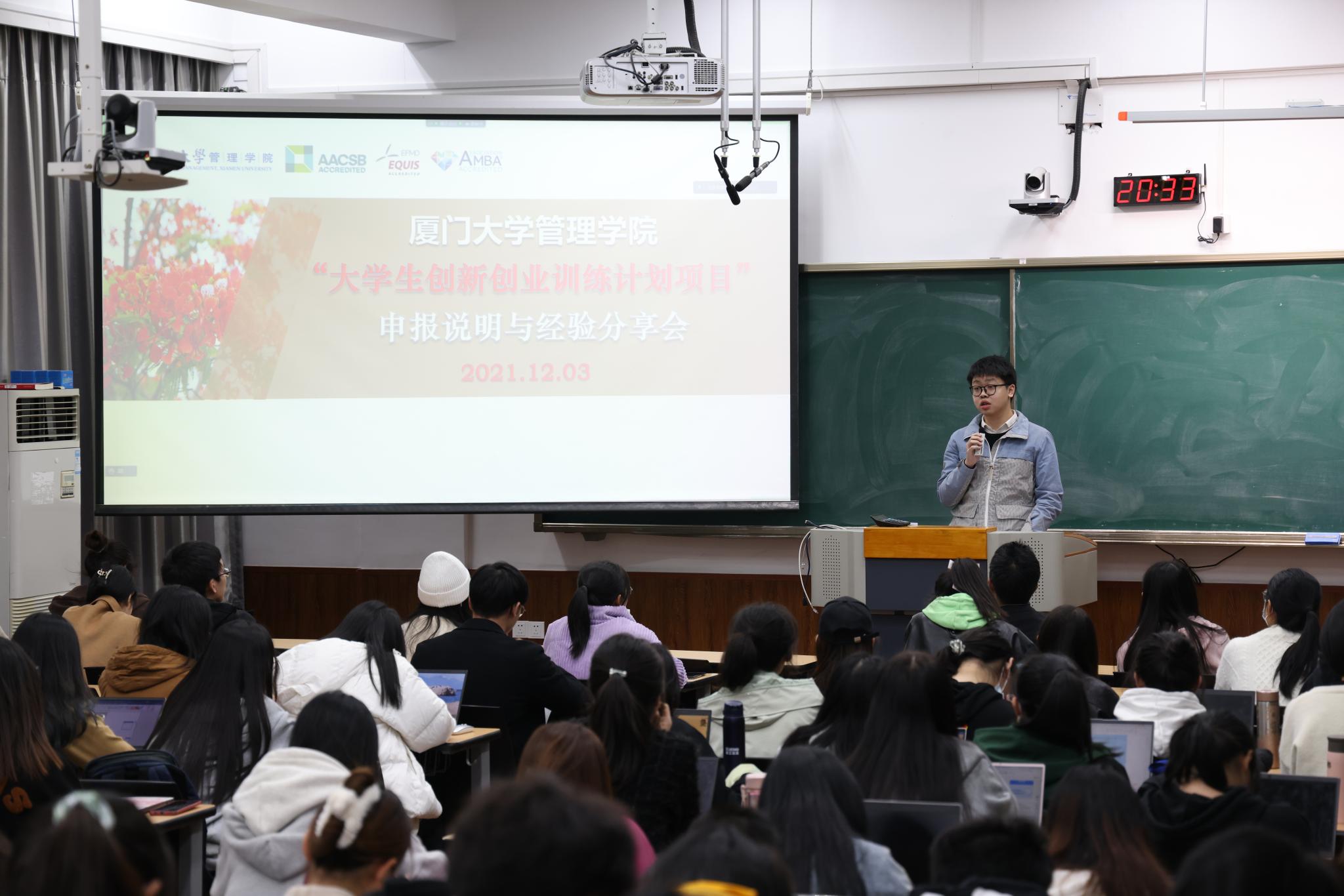 12月4日晚上,管理学院在南强二503、502等教室,以线上线下同步进行的方式,举办大学生创新创业训练计划项目解读与经验分享会。教务处杨炎老师应邀做政策解读、指导,国家级创新创业训练项目、第十四届全国大学生创新创业年会入选项目负责人马启越同学和互联网+校赛铜奖项目负责人余洪彪同学在会上做经验分享。管理学院2021级全体本科生以及2020级、2019级部分同学参会。活动由学院团委副书记揭上锋主持。