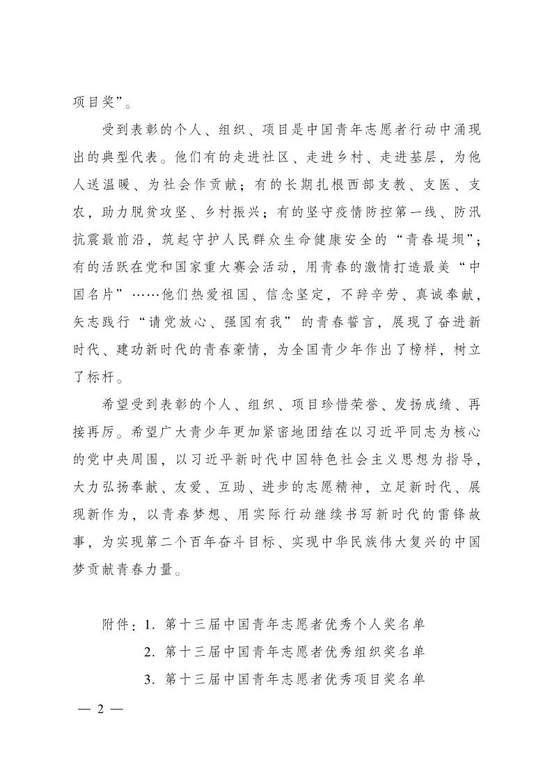 据悉,中国青年志愿者优秀个人奖、组织奖、项目奖是中国志愿服务领域的唯一表彰,也是当前志愿服务领域的最高荣誉。本届表彰严格落实参评资格、条件和程序,注重面向基层和一线选树先进典型,注重对重大事件、重点领域中表现突出的个人、组织和项目的激励,展示新时代青年志愿者的理想信念、爱心善意、责任担当,引导广大团员青年在新时代新征程上奋勇建功立业。