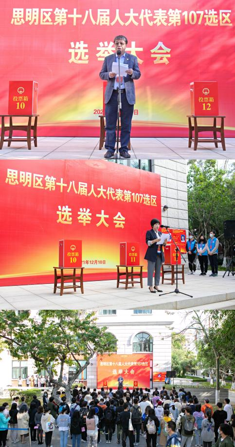12月10日上午,在现场热烈的氛围中,思明区第十八届人大代表厦门大学第107选区(管理学院分会场)选举大会在嘉庚二号楼前举行。厦门大学管理学院、财务管理与会计研究院师生选民参加选举大会,庄严投出神圣一票。