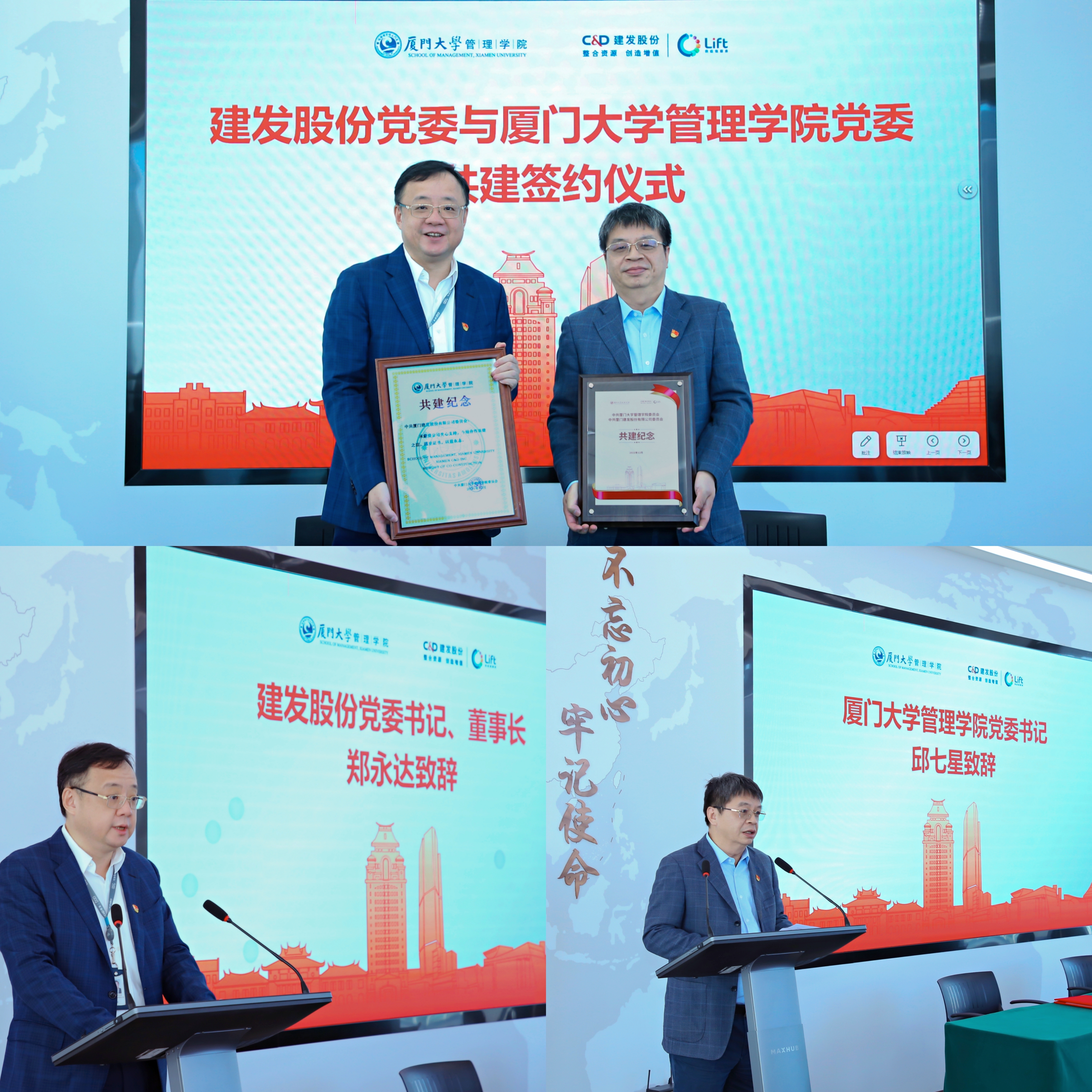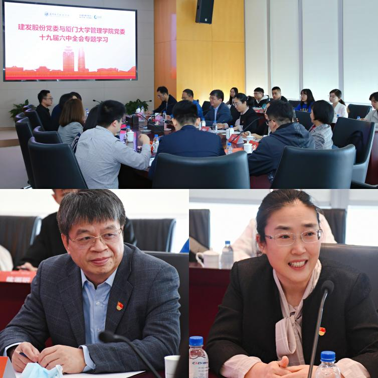 12月9日,为深入学习贯彻党的十九届六中全会精神,进一步落实新时代党建工作的新要求,拓展校企合作新领域,厦门建发股份有限公司党委、厦门大学管理学院党委举行共建活动,签署党委共建协议并开展第一次共建学习。厦门建发股份有限公司党委书记、董事长郑永达,党委办公室、人力资源部相关人员、管院毕业员工代表等出席。厦门大学管理学院党委书记邱七星,厦门大学党委组织部副部长曲延云,厦门大学管理学院党委副书记戴蓥、党务秘书江娇、办公室主任吴光锡、校友与对外合作办公室副主任王燊、辅导员高瑜聪出席活动。厦门大学管理学院学生党支部书记培训班学员参加活动。