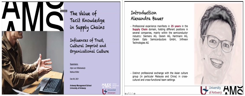 安特卫普大学工商管理学院的Alexandra BAUER博士分享了以The Value of Tacit Knowledge in Supply Chains - Influences of Trust, Cultural Imprint and Organisational Culture为题的论文。该研究挑战知识管理领域的一项突破:隐形知识的共享。供应链组织需要让员工愿意分享他们最宝贵的无形资产,以释放团队的知识能力,以实现卓越的绩效。文章考察了信任、隐性知识共享及其对供应链环境中团队绩效的影响之间的关系,试图在考虑构成主要焦点的组织文化和文化印记的情况下研究这些关系以及潜在的知识共享抑制因素和促进因素。