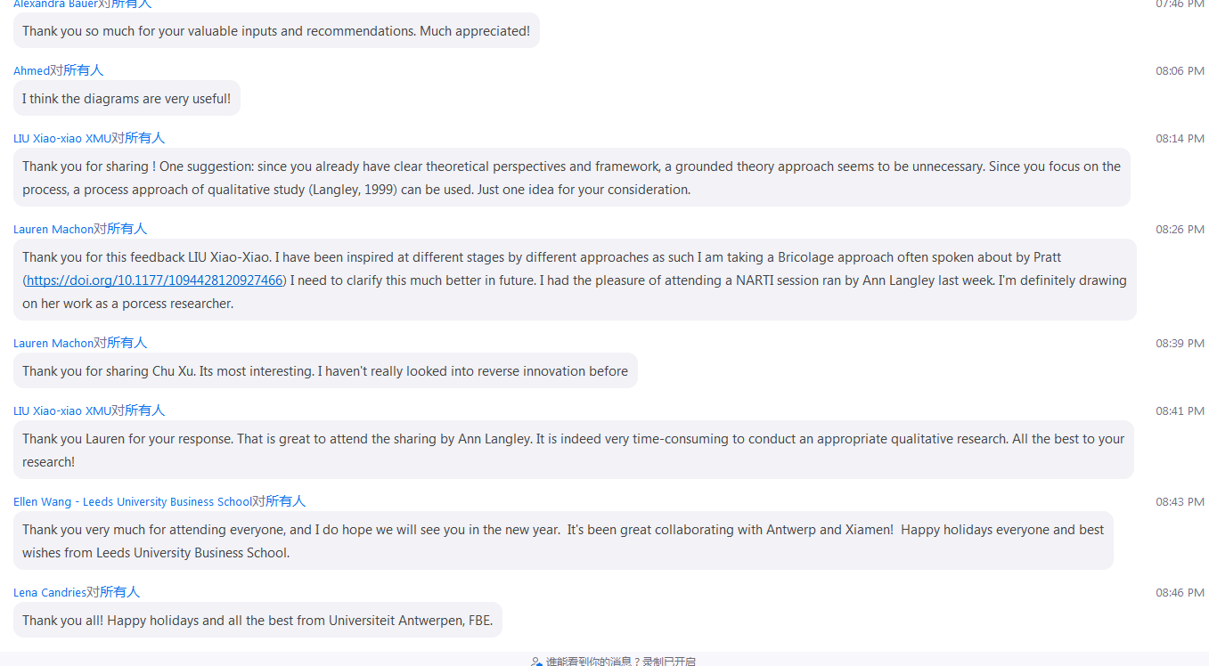 最后,白云涛教授做总结发言,感谢三位博士生的认真准备和精彩展示,感谢线上各位与会人员的热烈交流,共同探讨“管理创新”研究领域的研究方法与设计,有潜在社会价值的研究发现,希望博士生们通过会上的思想交锋,走出自我研究思维的舒适区,继续求索,在疑难中“选题”、在调研中“点题”、在实践中“破题”。该系列研讨会旨在将来自世界各地的博士研究生和教职员工联系起来,提供建立全球网络、拓展国际视野、交流知识的机会,并获得同行反馈。期盼中欧三校未来能够推进更多的交流、更多的合作,也期待疫情之后在利兹、在安特卫普、在厦门线下会晤。
