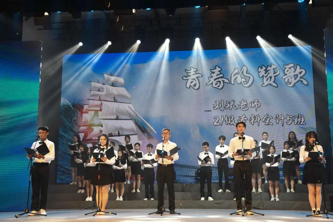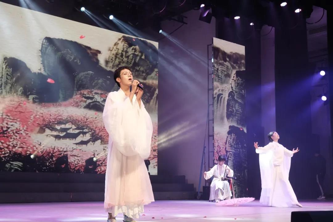 接下来,研究生马宁带来独唱《爱逝去后》,嗓音浑厚,让同学们联想起迷雾中的灯塔指引前路,上弦场的钟声指引迷津,自此,晚会进入了第二篇章“建南钟鸣 百年回荡”。2021级管理学院舞蹈队带来舞蹈《水出芙蓉》。她们头戴凤钗,手持折扇,在舒缓的音乐下翩翩起舞,在灯光的配合下,舞台上唯见嘉影款款而来,霓裳朵朵而起,芙蓉在舞台中央绽放。接着,七位2021级本科生带来的韩舞串烧《blackluv》收获了全场欢呼,绚烂的舞姿,既展现了青春的活力,也让观众领略到舞蹈的魅力。而带领我们走进草原风情的,是袁乐鑫,阿日斯楞带来的蒙语弹唱《特斯河之赞》,富有节奏的旋律,让观众随之鼓掌,献上哈达的习俗,尽显蒙古人民的热情。在新疆舞《天山之春》中,四位新疆姑娘用她们婀娜的舞姿,展现了维吾尔族姑娘对爱情的期许。而后,班主任代表、企业管理系刘斌老师和2021级会计五班带来的诗朗诵《青春的赞歌》,勉励全体商科人高唱青春赞歌,一路唱响,歌声嘹亮。