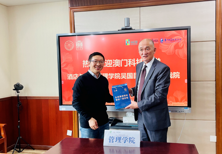 吴国民院长感谢我院的热情接待,他表示,澳门科技大学建校于2000年,今天是12月20日,恰逢澳门回国祖国22周年纪念,今日与内地洽谈交流是非常有意义的一天。澳门和厦门,两个城市很像,都是旅游城市,注重旅游与酒店业的发展。未来澳门科技大学酒店与旅游管理学院将更加注重旅游管理和酒店管理的科研学术发展,为了进一步促进这个目标的落实,能够与厦门大学管理学院学习交流,共同致力于旅游与酒店业的发展,实属幸事。