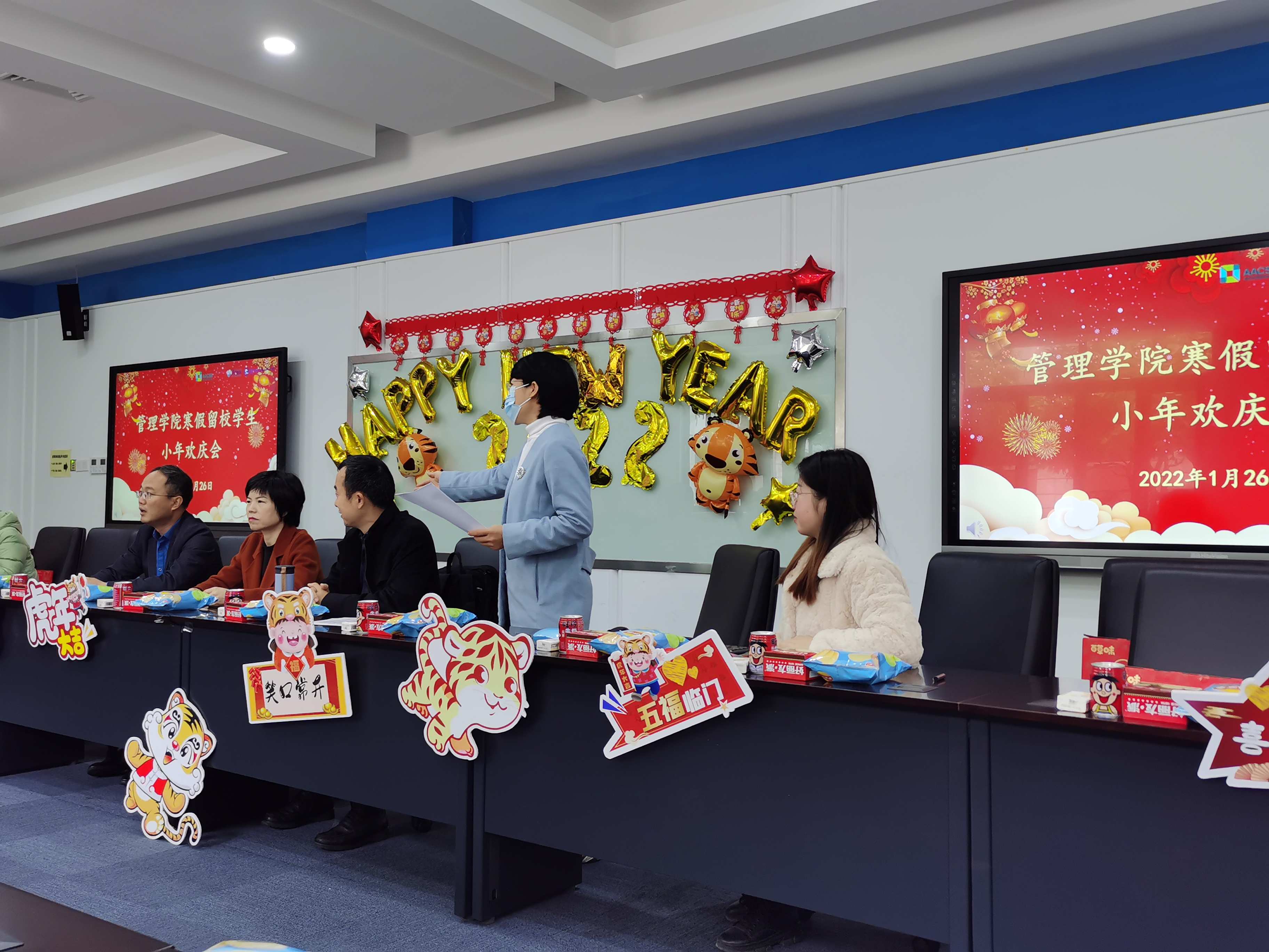 1月26日上午9点,在精心布置、年味浓浓的嘉庚一100,管理学院寒假留校学生小年欢庆会内容丰富、气氛热烈。学院党委副书记郑碧娇、戴蓥,团委书记蒋超杰、团委副书记揭上锋、辅导员邵亢邑与留校过年学生齐聚一堂,共庆新春佳节。活动由蒋超杰、揭上锋主持。