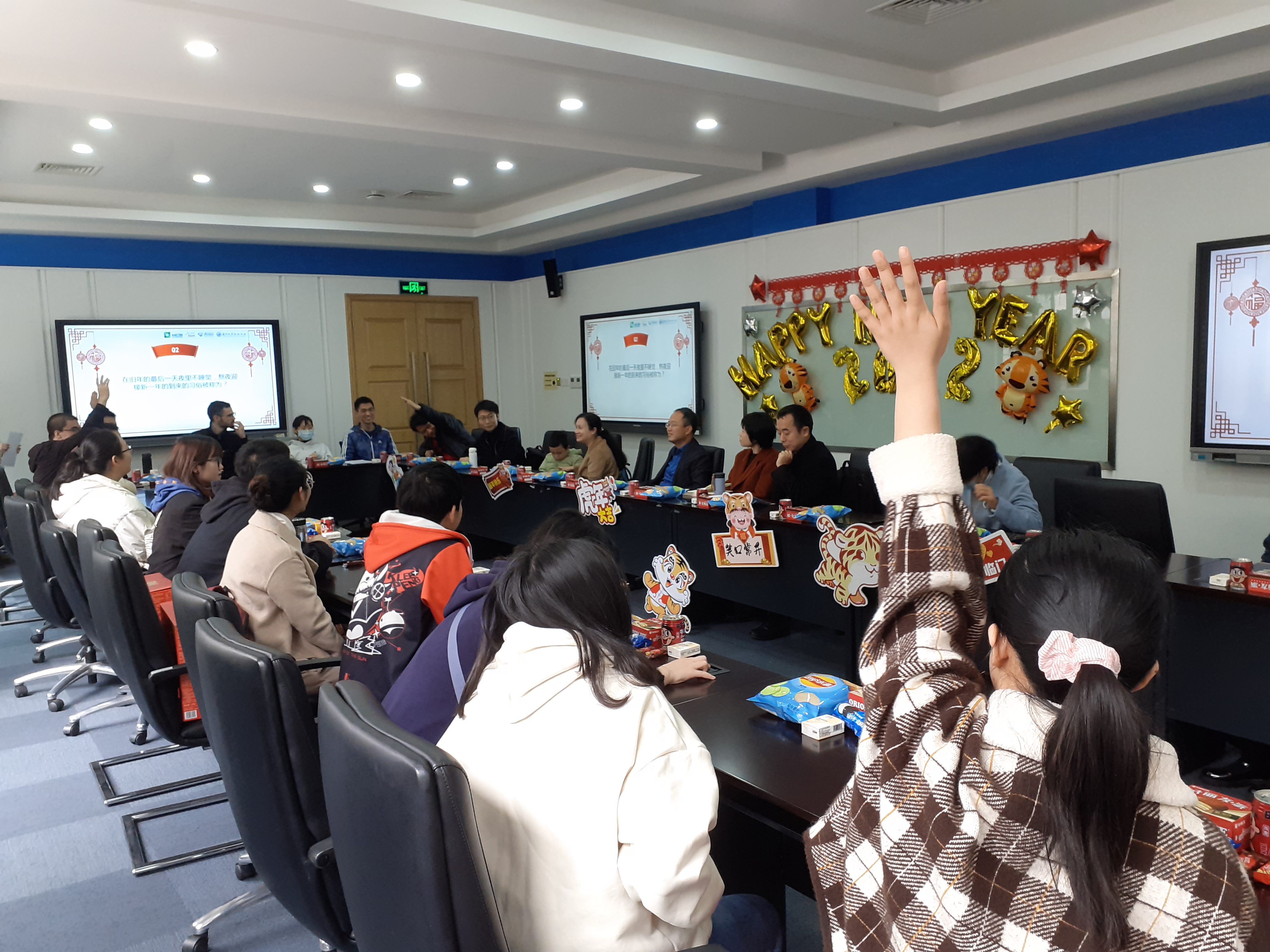 紧接着是趣味十足的游戏环节,分为开门大吉、如虎添翼、喜从天降、福满门庭四个环节,内容涉及春节、生肖、二十大、冬奥会等专题,同学们积极互动、热情参与。