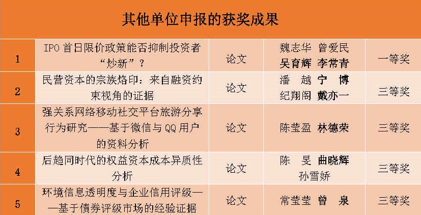 福建省社会科学优秀成果奖由福建省人民政府委托福建省社会科学界联合会具体负责评奖活动的管理、组织和实施,该奖项每两年评一次,是福建省人民政府颁发的省社科界最高奖项,旨在繁荣和发展我省社会科学事业,奖励在社会科学方面做出贡献的集体和个人。据悉,本届共评出305项成果,其中一等奖30项、二等奖104项、三等奖171项。