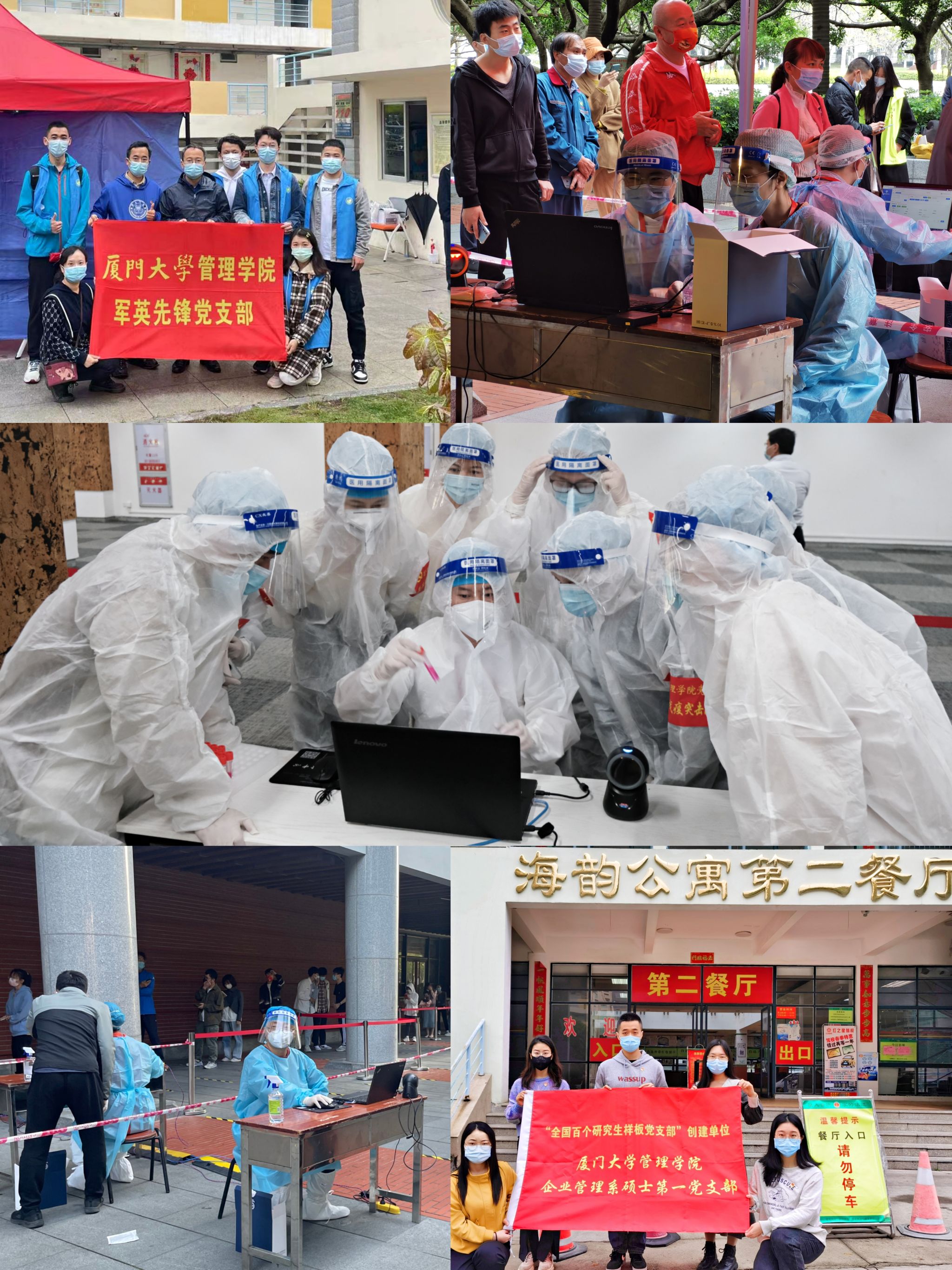 疫情发生以来,学院党委始终把投身工作第一线作为守初心、担使命的试金石和磨刀石,高度重视发挥党支部的战斗堡垒作用和党员先锋模范作用。在3月15日厦门大学校园核酸检测志愿服务中,管理学院14名教职工党员、志愿者积极响应党委号召,组成学院教工战疫突击队再出征,他们身着防护服在核酸检测现场开展检测引导、信息录入工作,连续作战5小时,确保学校全员核酸检测顺利开展。学院于李胜、杜之利、于小偶、江娇、杨南燕、廖晓红、翁苏伟、王国静等教职工以身作则、冲锋在前,加入厦门大学应急志愿队,24小时在校内随时待命、不离校园,在非常时期体现了人民教师的责任与担当。“全国百个研究生样板党支部”创建单位、管理学院企业管理系硕士第一党支部号召学院全体党员、积极分子积极参与校园疫情防控志愿服务,联合学院青年志愿者协会牵头包干海韵学生公寓二期食堂、南光餐厅测温志愿服务,百余名管院青年积极投身活动;学院青年志愿者协会向全院学生团支部发出倡议组建学校疫情防控学生志愿者突击队,2天时间内共有830名同学“集结完毕”随时待命上岗工作;由退伍大学生党员组成的军英先锋党支部发扬军人冲锋在前的担当精神,第一时间将2383份新冠肺炎抗原试剂盒发放到各班级,并主动为身处封控区的学生传递防疫物资,他们用实际行动守护校园,筑牢疫情防控防线。学院还对院楼、公共区域等进行每日消杀,将扫码、测温、戴口罩的规定严格执行到进入院楼的每位师生,坚决阻击疫情进入校园,保障师生员工生命安全。