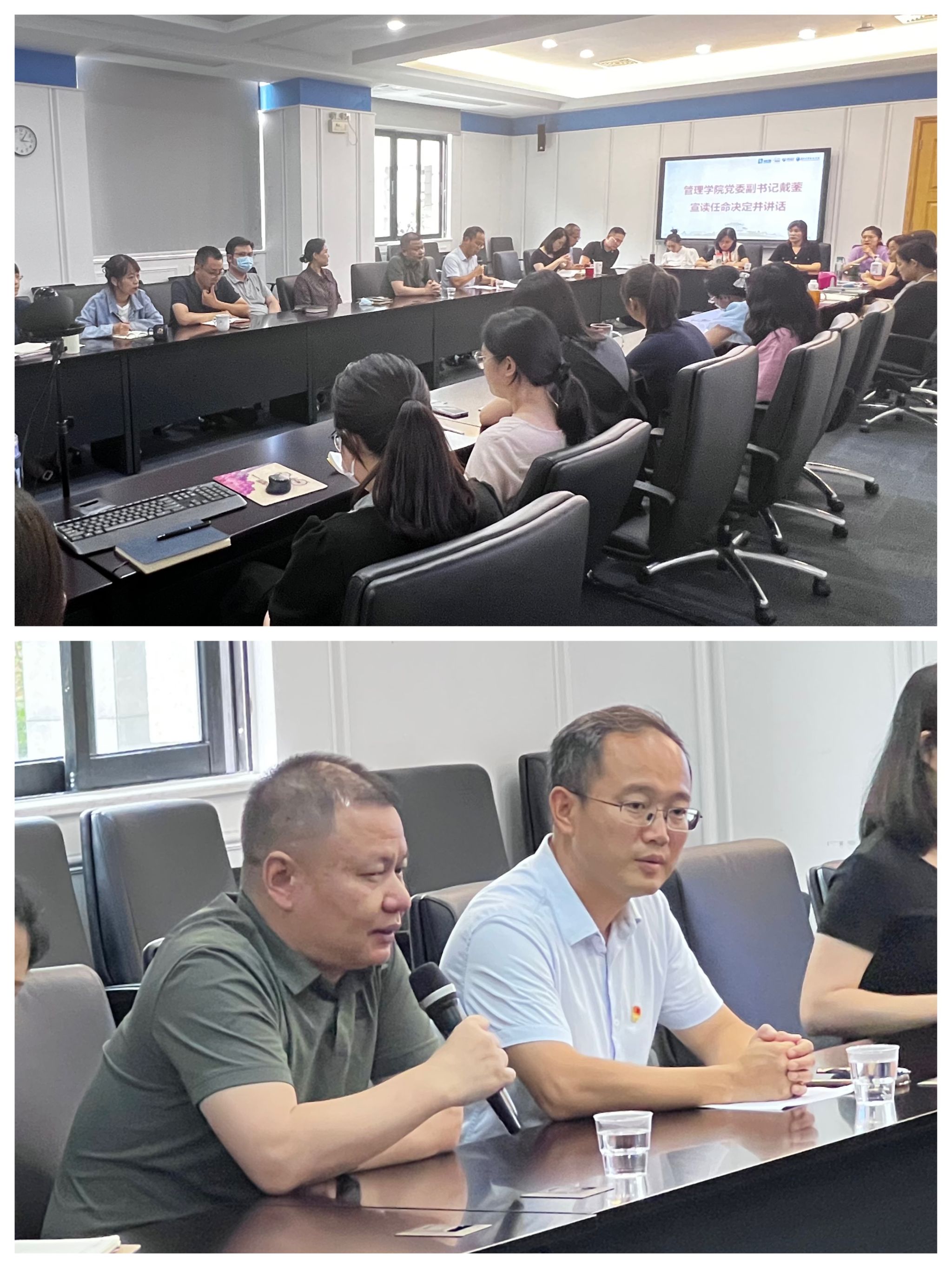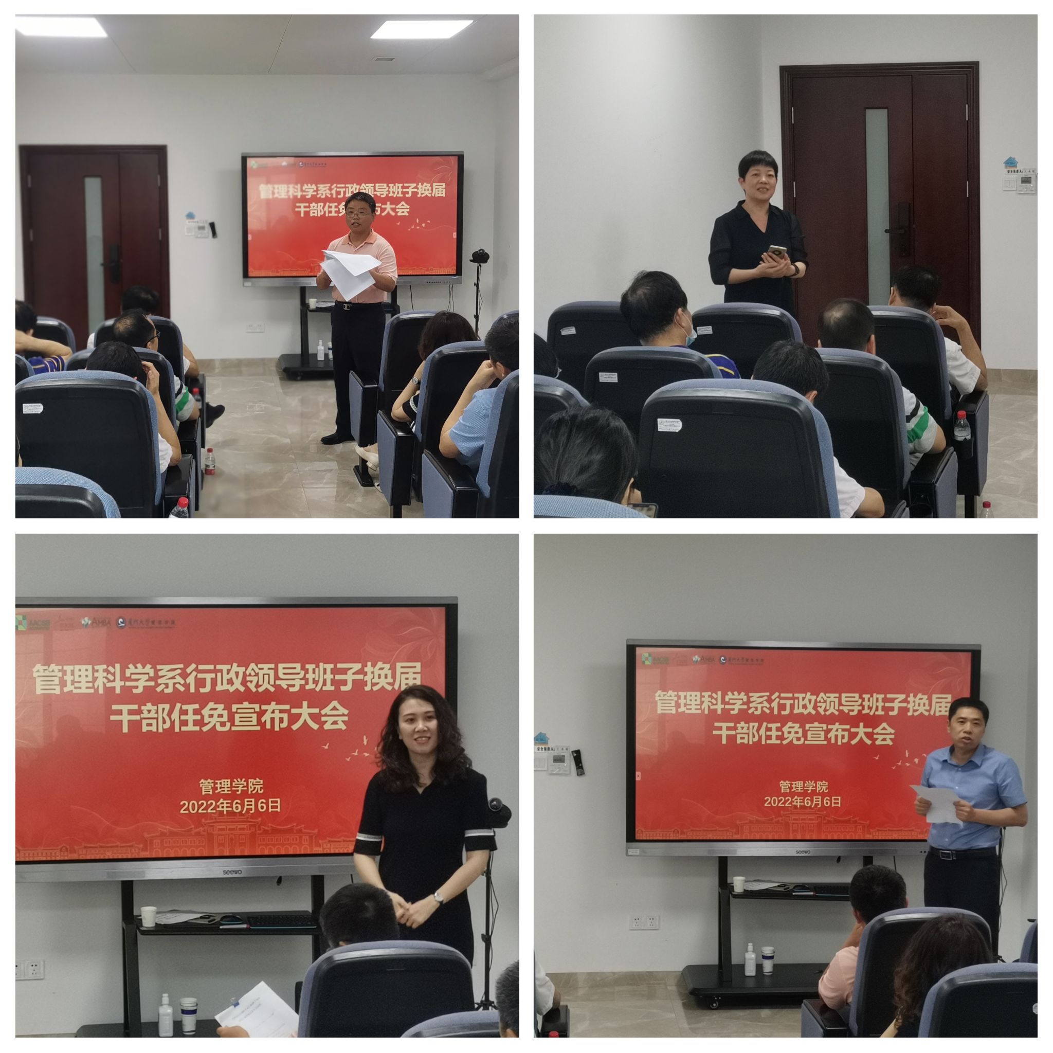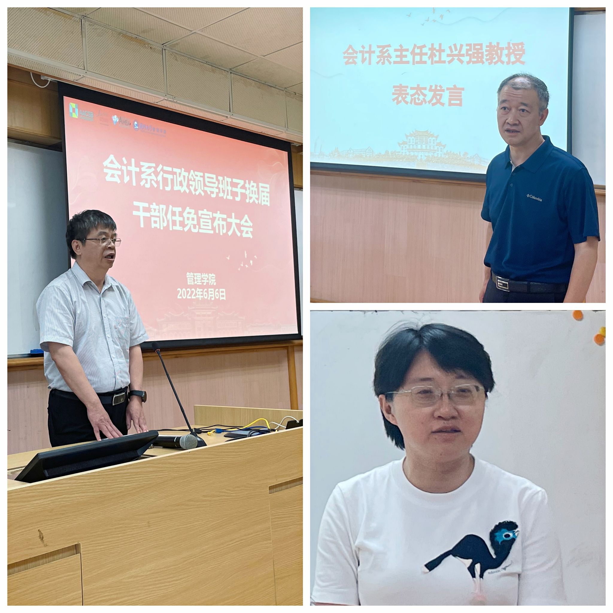 6月6日下午,管理学院各系、中心行政领导班子换届干部任免宣布大会在学院各会场分别举行。管理学院院长李建发,党委书记邱七星,常务副院长吴超鹏,党委副书记郑碧娇、戴蓥,副院长于李胜、白云涛等党政领导分别主持会议,各系、中心新老班子成员、教职工参加会议。