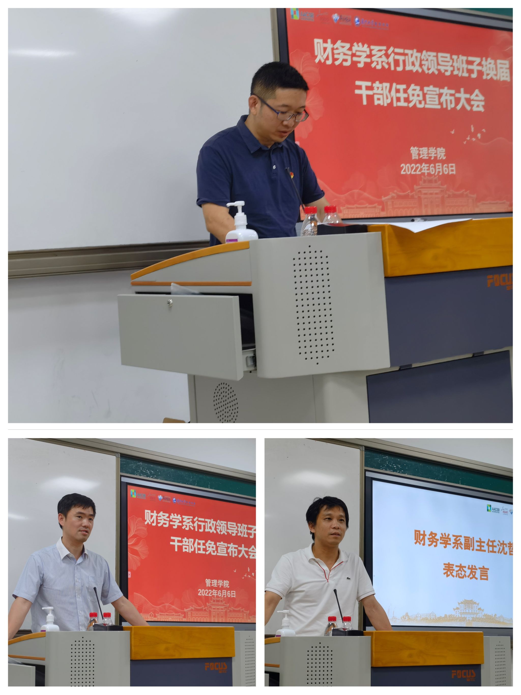 会上,各系、中心上一任行政领导班子对各位教职工对其工作的帮助和支持表示了诚挚的谢意。新任行政领导班子成员也分别发言表态,表示坚决拥护学校党委、学院党委的决定,继续坚持党的全面领导,不忘初心、牢记使命,深入学习贯彻党的十九大和十九届历次全会精神以及习近平总书记系列重要讲话精神,认真履职尽责,以更宽的视野、更高的站位、更强的战略思维和创新精神,以人才培养为根本任务,以学科建设为核心,为把学院建设成中国商学院中世界知名、国内一流,最具特色的南方之强而奋斗。