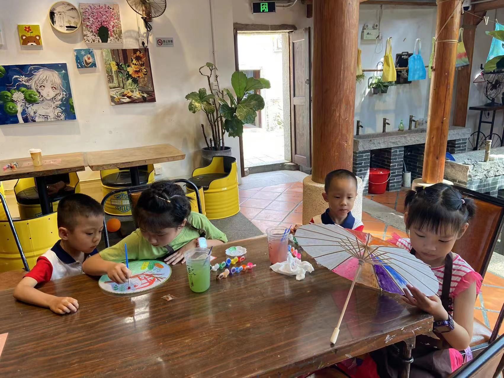 午餐后,大人们泡茶、桌游。孩子们参加亲子手作,制作团扇、手绘纸伞,体验亲子手作的乐趣的同时,传承中华优秀传统文化、提高动手技能,培养孩子热爱动手的品质。