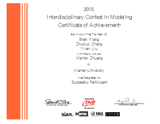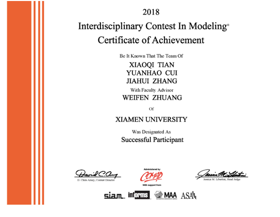 三名成员,两名为管理学院的管理科学系和会计系,另一名来自信息科学与技术学院,在这次2018年美国大学生数学建模比赛中获得三等奖。