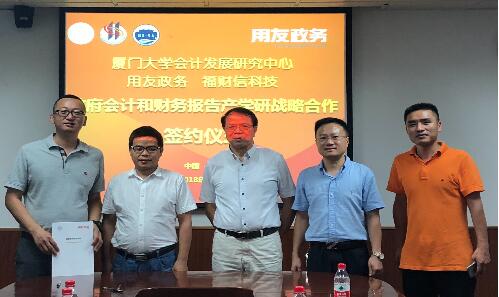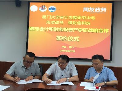 在国家治理体系、治理能力现代化建设和新《预算法》颁布实施大背景下,我国政府会计和财务报告改革正如火如荼地进行。政府会计准则和《政府会计制度》如何落地实施,是理论界和实务界迫切需要解决的问题。鉴于此,我中心与企业联合围绕政府会计准则制度实施等建立产学研协同创新平台,助推经济社会发展和国家善治。2018年6月7日,厦门大学会计发展研究中心与用友政务签署了校企战略合作协议。我中心副主任傅元略教授、管理学院会计系副主任张国清教授、用友政务软件有限公司曹勇强先生、福财信电脑科技有限公司吴进建先生参加了签约仪式。