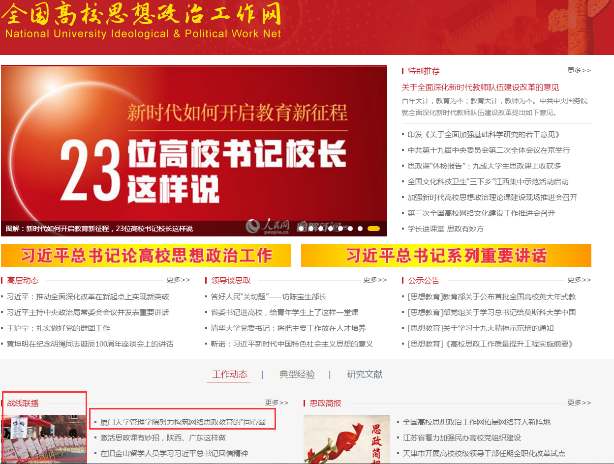 2月11日,全国高校思想政治工作网(http://www.sizhengwang.cn)在《工作动态》专栏中报道厦门大学管理学院网络思政教育的专题文章《厦门大学管理学院努力构筑网络思政教育的“同心圆”》。