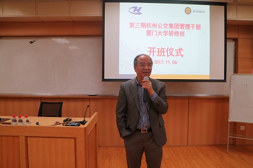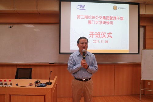 11月6日上午,第三期杭州公交集团培训班在厦门大学嘉庚二208教室开班。厦门大学金圆研究院院长屈文洲、杭州市公共交通集团有限公司董事长黄志耀出席了开班仪式并致辞。