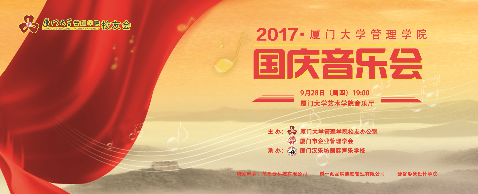 2017年9月28日,时值国庆、中秋双节来临,由厦门大学管理校友办公室、厦门市企业管理学会联合主办,汉乐坊国际声乐学校承办的“国庆音乐会”将在厦门大学艺术学院音乐厅隆重举行,为大家带来一场音乐盛宴,回馈广大师生、校友对管理学院一如既往的关爱和支持,共度佳节。