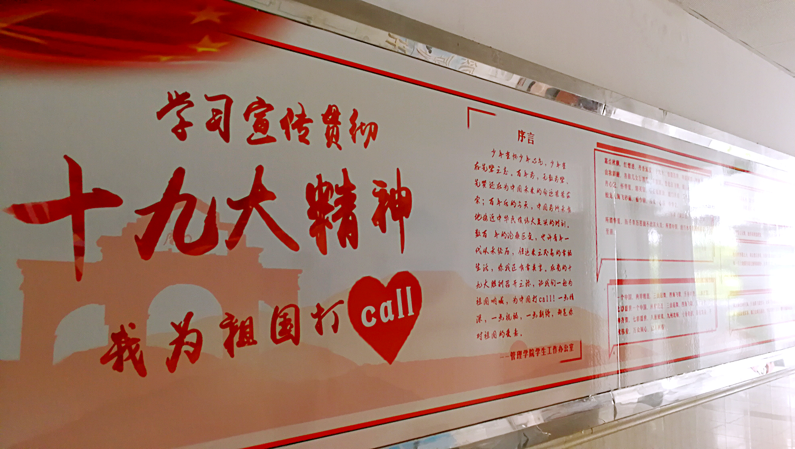 学习宣传党的十九大精神,是管理学院近期以来思想政治工作的重中之重,全院师生将秉承“全员动员、全身参与、全心投入”的指导方针,以“走进现场、走进讲坛、走进网络、走进课堂、走进操场”为全新路径,推动全院师生学习宣传贯彻党的十九大精神。