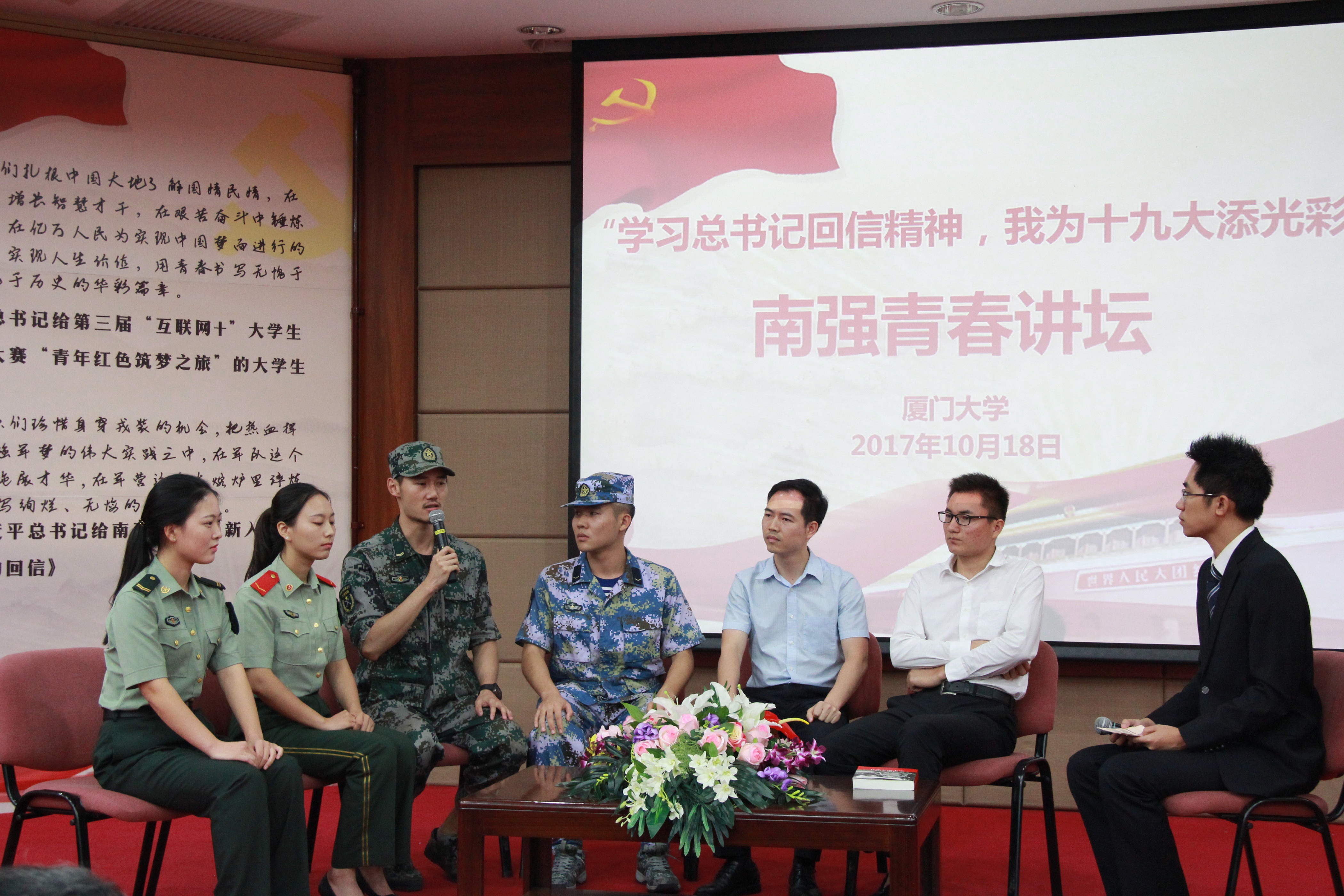 为了以先锋引领激励朋辈力量,使青年大学生再次审视自己的人生坐标,张望更加遥远的未来,培养学生直面挑战的社会担当。管理学院联合校党委学生工作部、人民武装部,举办2017年厦门大学“南强青春讲坛”,邀请来自全校各学院的退伍大学生以及创新创业代表,以优秀学子“公开课”的形式,向全校师生分享个人故事。从雪域高原的中印对峙,到南海风云的大国重器,从创业先锋的人生波折,再到创新驱动的企业领航,一个个故事的娓娓道来,让在场师生深受感染与触动。