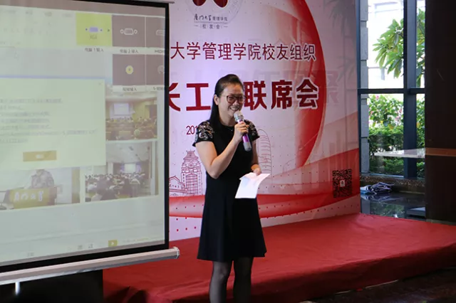 管理学院校友会秘书长孟林明老师致辞,他总结了这一年来学院校友工作取得的成果,学院的综合实力进一步的夯实,学院校友办公室也得到了各界的一致好评,感谢秘书长们始终心系母校、对这一年的校友工作的支持。