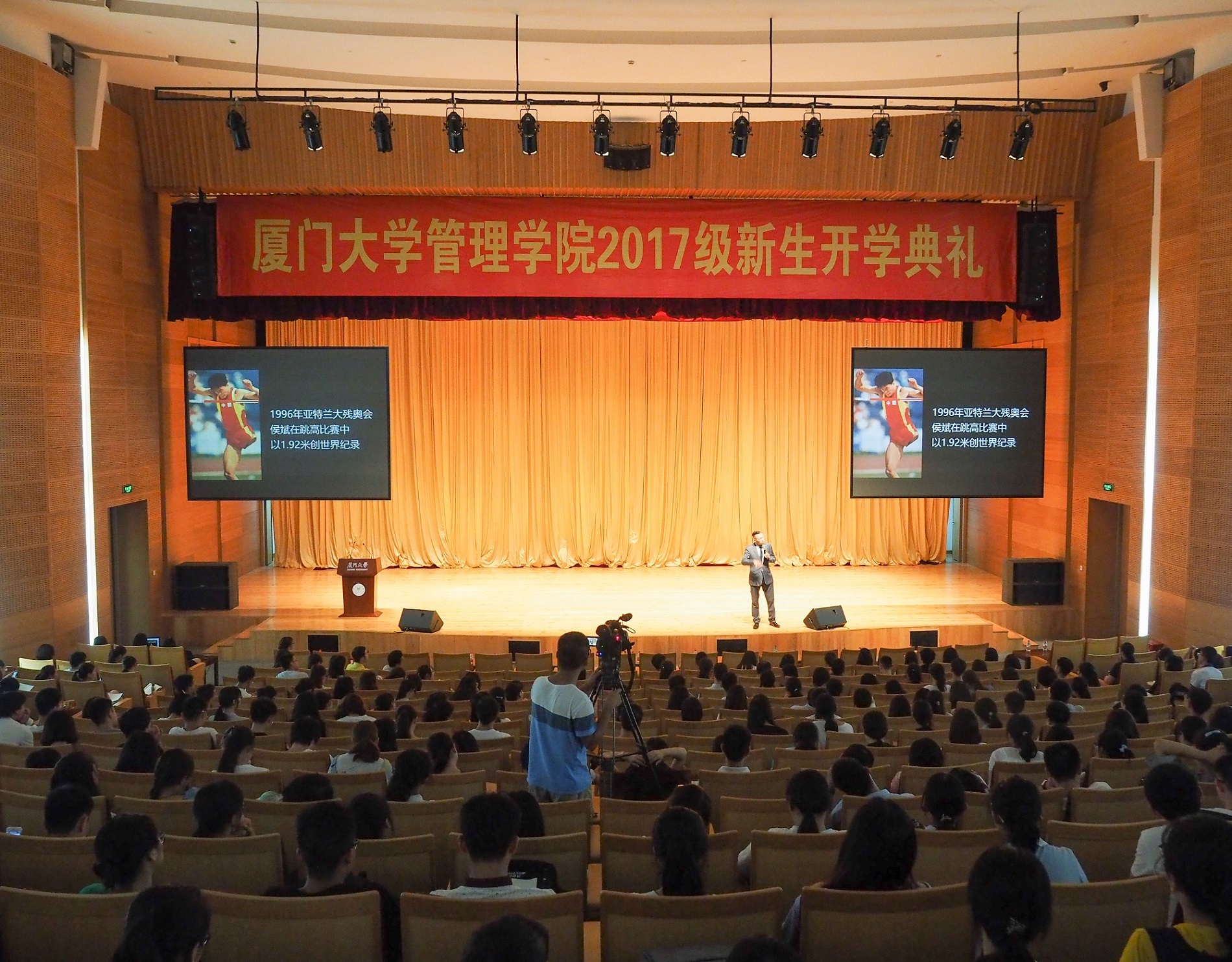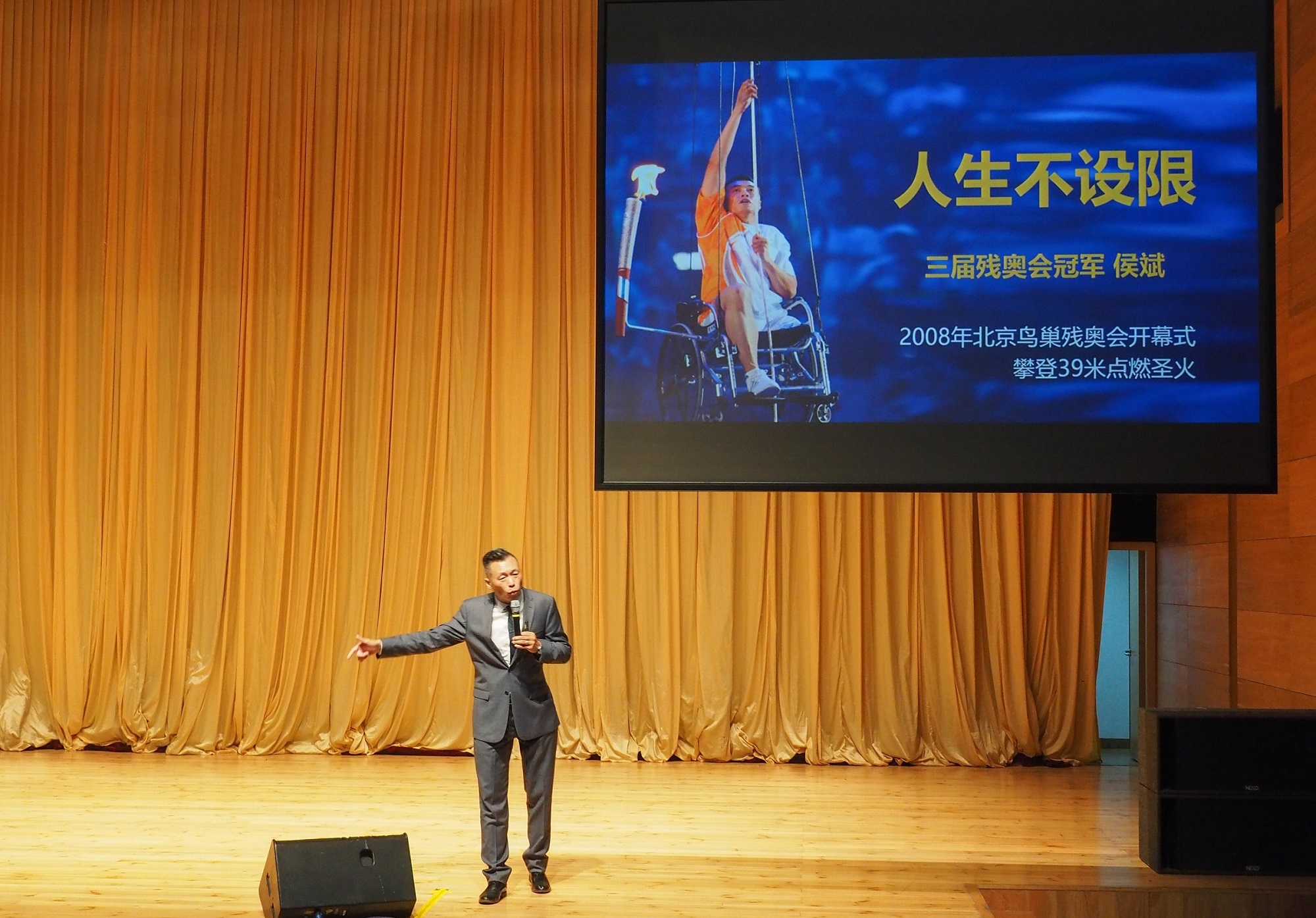 9月11日下午,蝉联三届残奥会冠军、2008年北京残奥会主会场火炬手侯斌校友为管理学院2017级全体新生带来了一场主题为《人生不设限》的精彩演讲。