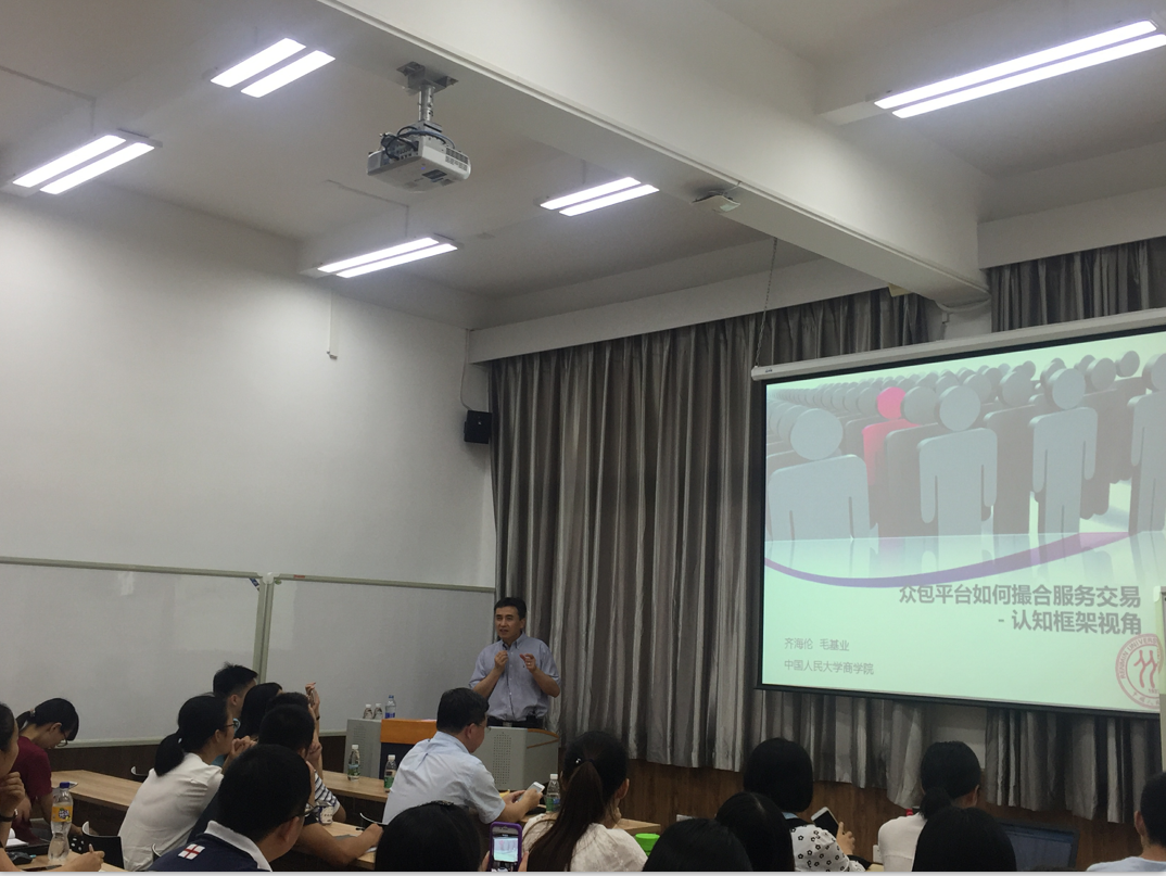此次南强讲座毛基业教授从一个现实案例入手,针对创意设计服务作为众包在线交易的特点和方法,分别从教学和研究两个角度,介绍了其研究团队对全国最大的服务众包平台猪八戒网的研究过程和成果。毛基业教授介绍了猪八戒网较为独特的创业过程和商业模式,特别是针对创意设计服务的个性化需求、主观评价标准、低频次交易等特征所采取的一系列撮合措施。同时,基于猪八戒网的单案例研究,呈现基于案例的归纳式理论构建过程,以及所构建的一个创意设计众包平台的交易撮合过程模型。