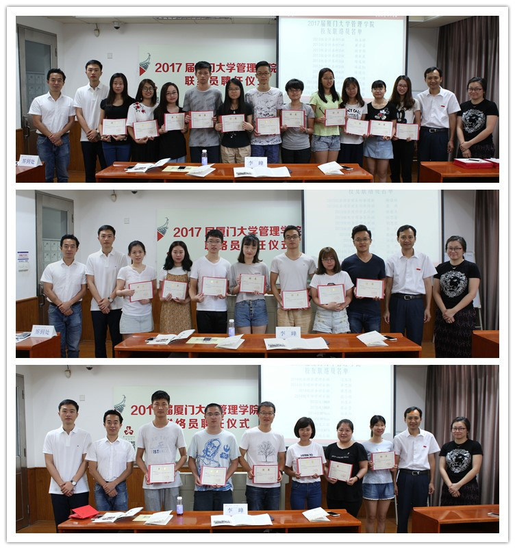 6月10日,由学院校友办公室举办的“第二届厦门大学管理学院校友联络员联谊活动暨2017届校友联络员聘任仪式”顺利举行。本次活动邀请到管理学院党委副书记李峰老师、校友办公室主任林菁老师、毕业班级辅导员吴光锡老师和揭上峰老师,与新老校友联络员们同交流、共分享。