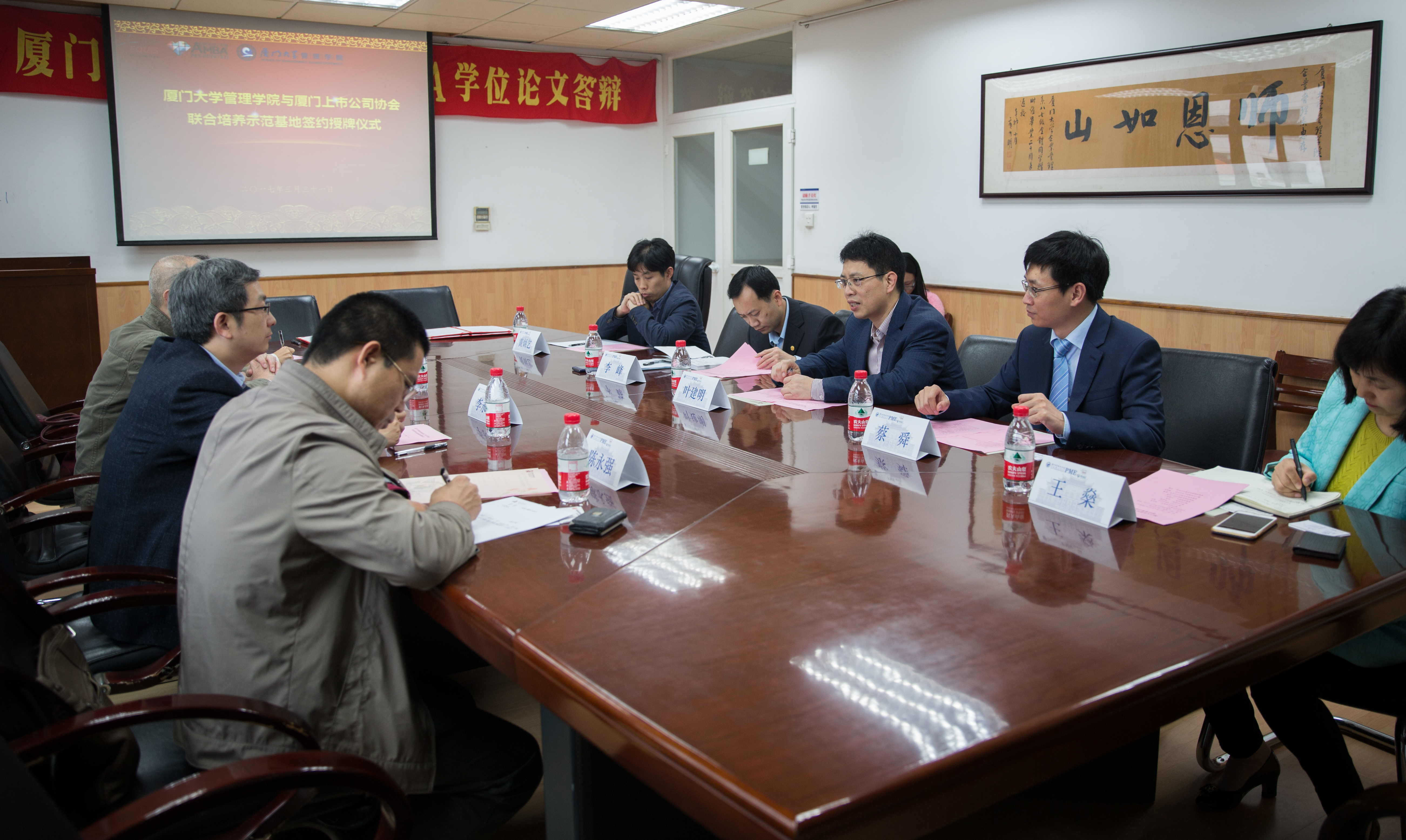3月31日下午,厦门大学管理学院与厦门上市公司协会在厦门大学管理学院举行了联合培养示范基地签约仪式和联合培养座谈交流会。厦门证监局局长李永春、厦门上市公司协会会长吴坚、厦门证监局公司监管处长陈永强、厦门证监局公司监管处副处长朱琳,厦门大学管理学院院长叶建明、党委副书记李峰、专业硕士中心主任蔡舜、MPAcc中心主任黄炳艺、职业发展中中心主任王燊等双方有关人员共同出席了此次活动。签约仪式及座谈交流会由专业硕士中心主任蔡舜教授主持。