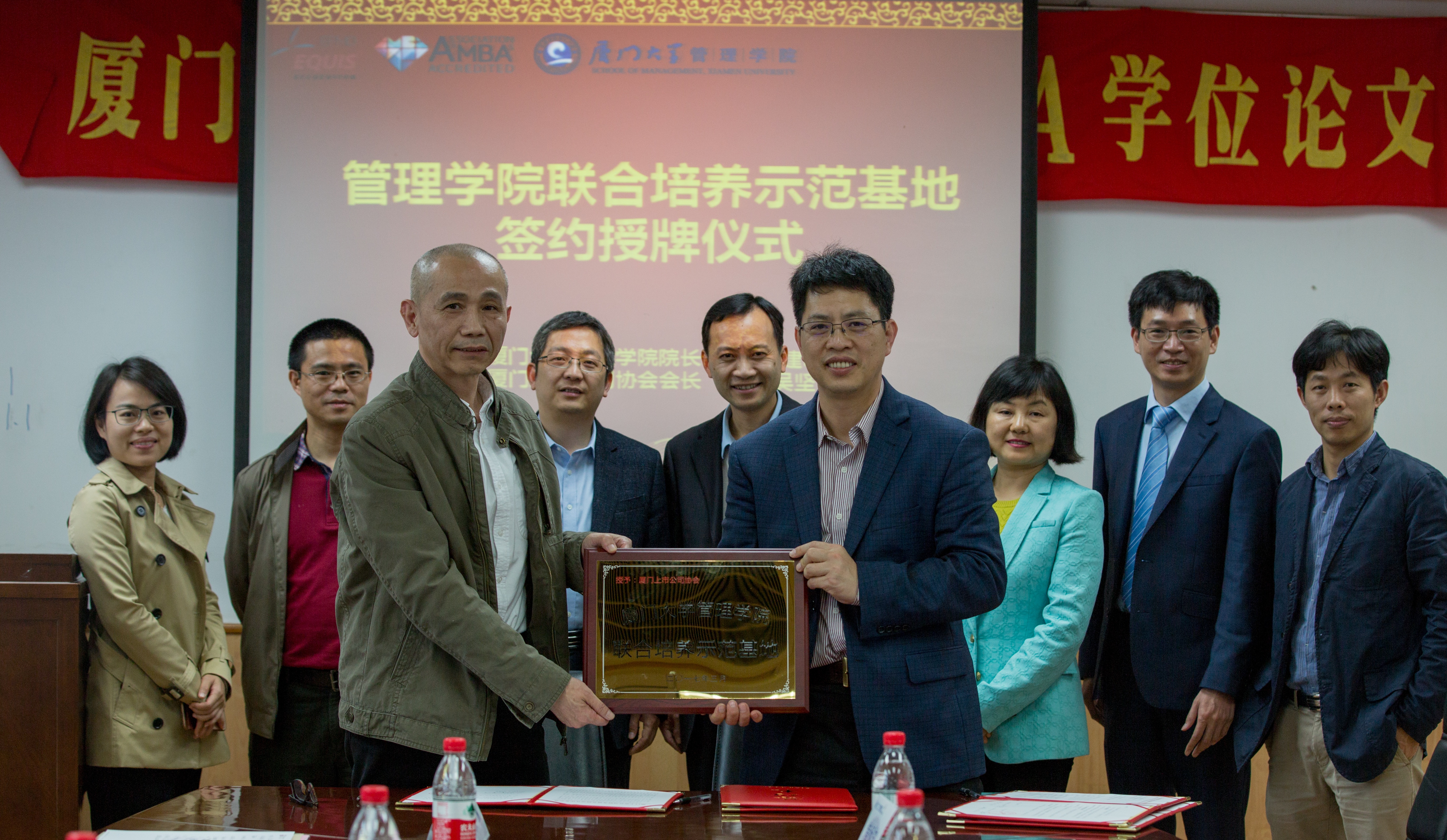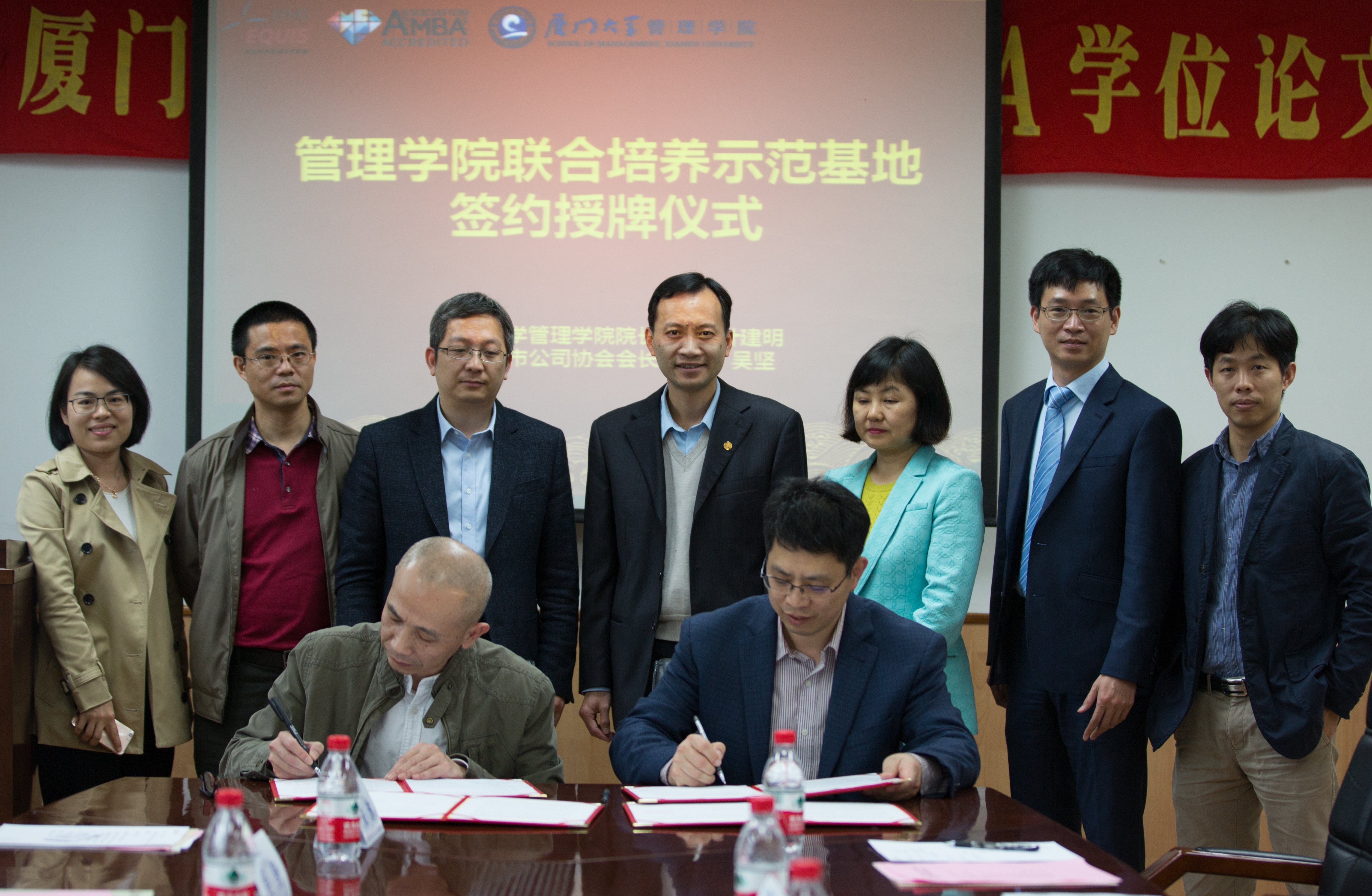 叶建明院长首先对厦门上市公司协会、厦门证监局一行表示了热烈欢迎,并指出社会实践环节在研究生培养过程的重要性,开展研究生联合培养示范基地建设工作是研究生教育综合改革的重要举措,其目的在于探索创新人才培养模式。叶院长同时介绍了管理学院的学科专业和定位,尤其是厦门大学会计专业硕士(MPAcc)的人才培养定位,并希望通过建立联合培养示范基地,共同培养更优秀的毕业生。李永春局长非常肯定厦门大学会计学科在研究生培养方面的突出贡献,希望以本次联合培养示范基地的签署为契机,在共同研究、共同培养、输送人才上发挥厦门大学会计专业硕士的优势,实现资源共享、互惠互利、强强联手,提升设站高校和单位的学科建设水平、人才培养质量和科技研发能力。吴坚会长强调厦门上市公司协会是一家服务于厦门上市公司的社会团体,在推进上市公司现代企业制度建设和诚信建设,自觉履行社会责任,促进上市公司和多层次资本市场的持续健康发展起着重要作用,希望与厦门大学管理学院共同建立长期的联合培养机制,共同培养更加优秀的“通过验证”的人才,在服务厦门上市公司方面发挥更大的作用。