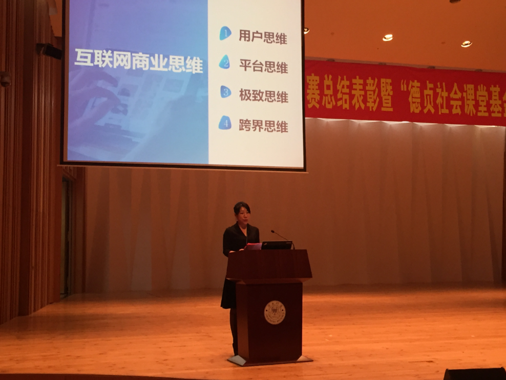 颁奖过后,管理学院党委副书记洪秋霞作为先进集体代表作了主题为《互联网商业思维下的学生学术科创》的发言。整场发言以“用户思维——以学生为中心”、“平台思维——活动引爆流行”、“极致思维——践行工匠精神”、“跨界思维——打破思维边界”为主体脉络,与在场师生交流分享了管理学院组织开展科创竞赛的经验与体会。洪老师的发言生动朴实,贴近实际,引起全场师生的高度赞扬与深切共鸣。