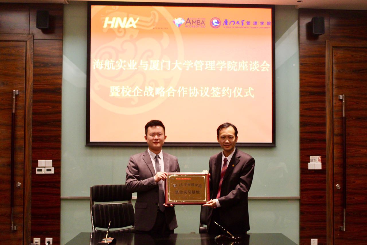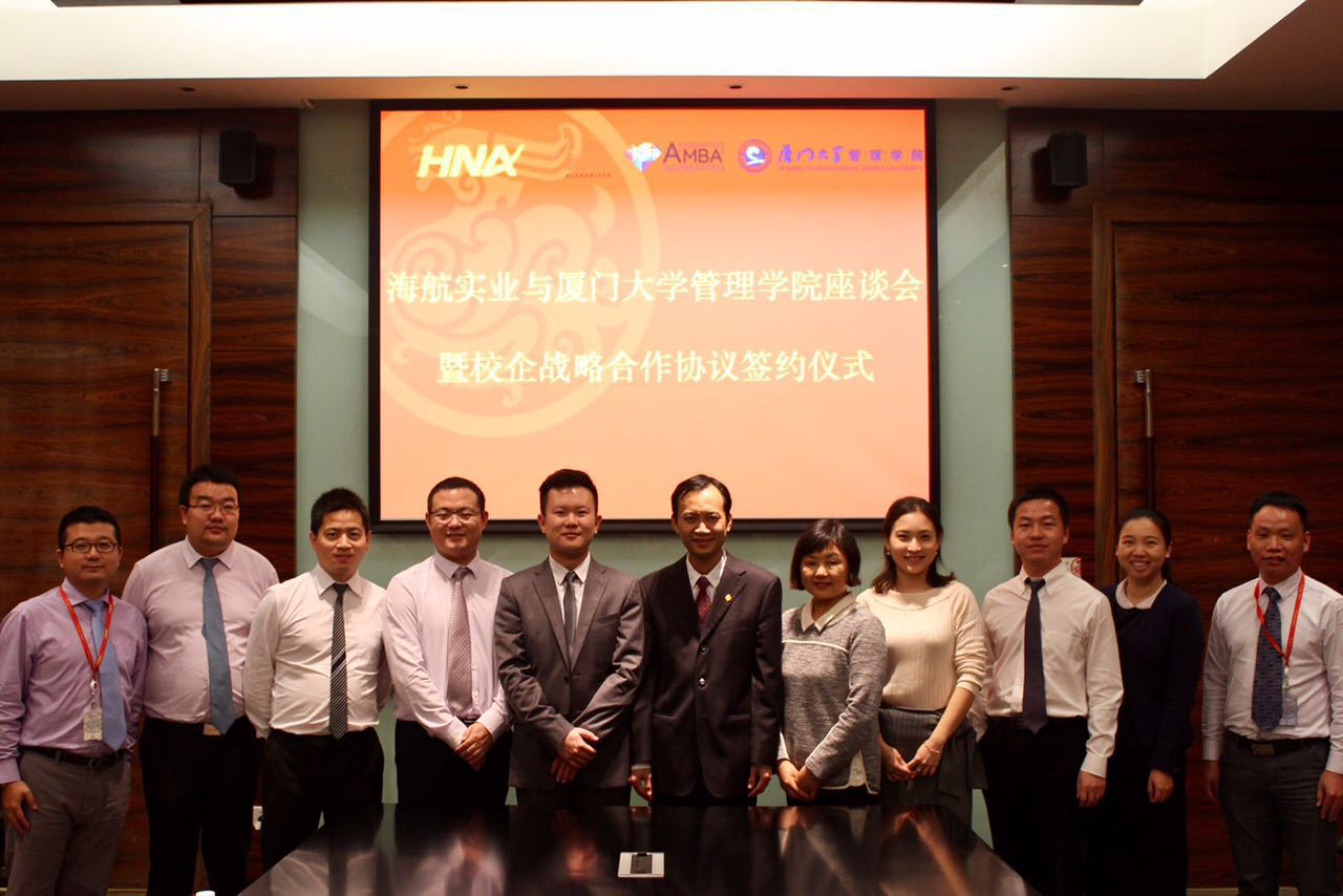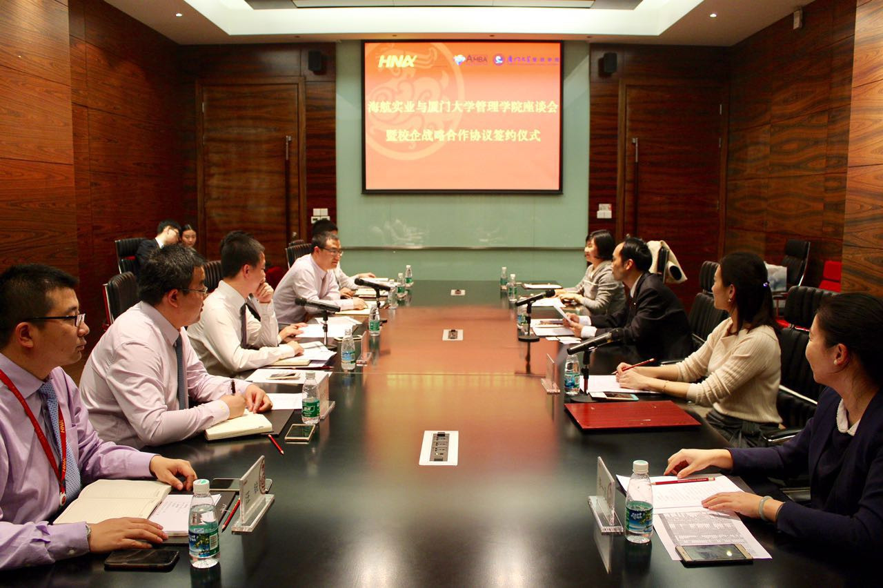 12月22日下午,厦门大学管理学院与海航实业集团有限公司(以下称为海航实业)在海航大厦举行了校企双方座谈会和战略合作协议签约仪式。海航实业集团人力资源总监胡明哲、人力资源部总经理助理李一凡、人力资源部中心副经理李庆、海航基础人资行政部总经理叶向元、海航投资人资行政部总经理汪锐、供销大集人资行政部总经理庞连义、海航机场人资行政部总经理侯长勇、海航资产人资行政部副总经理张培杰,厦门大学管理学院党委副书记李峰、职业发展中心主任王燊等双方有关人员共同出席了此次活动。座谈会由海航实业集团人力资源部副总经理徐露主持。