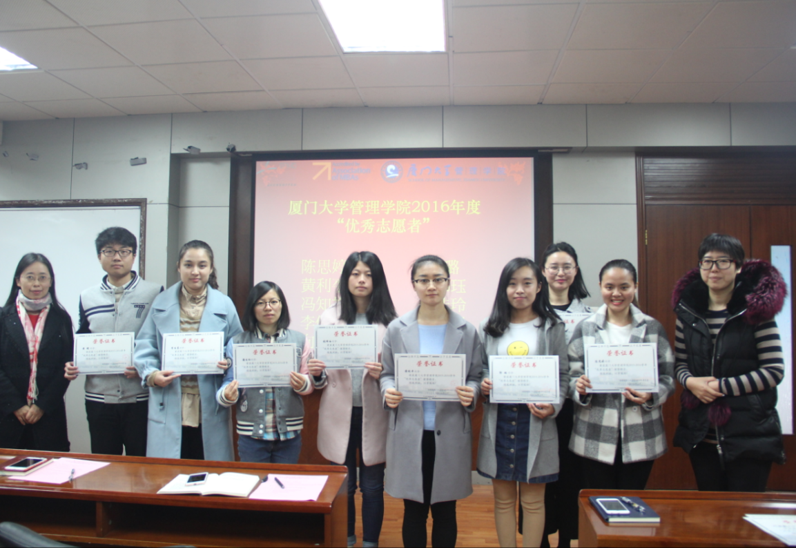 3月16日中午,厦门大学管理学院2016年度“优秀青年志愿者”表彰大会暨厦门大学“毕马威杯”管理案例分析全国十强邀请赛志愿者总结大会于嘉庚二201室顺利召开。校团委副书记孙佳,管理学院党委副书记李峰、洪秋霞,团委书记江娇,团委副书记吴荣梅、吴光锡,辅导员揭上锋、邵亢邑、刘晓宇出席表彰大会。大会由管理学院团委副书记周颖主持。