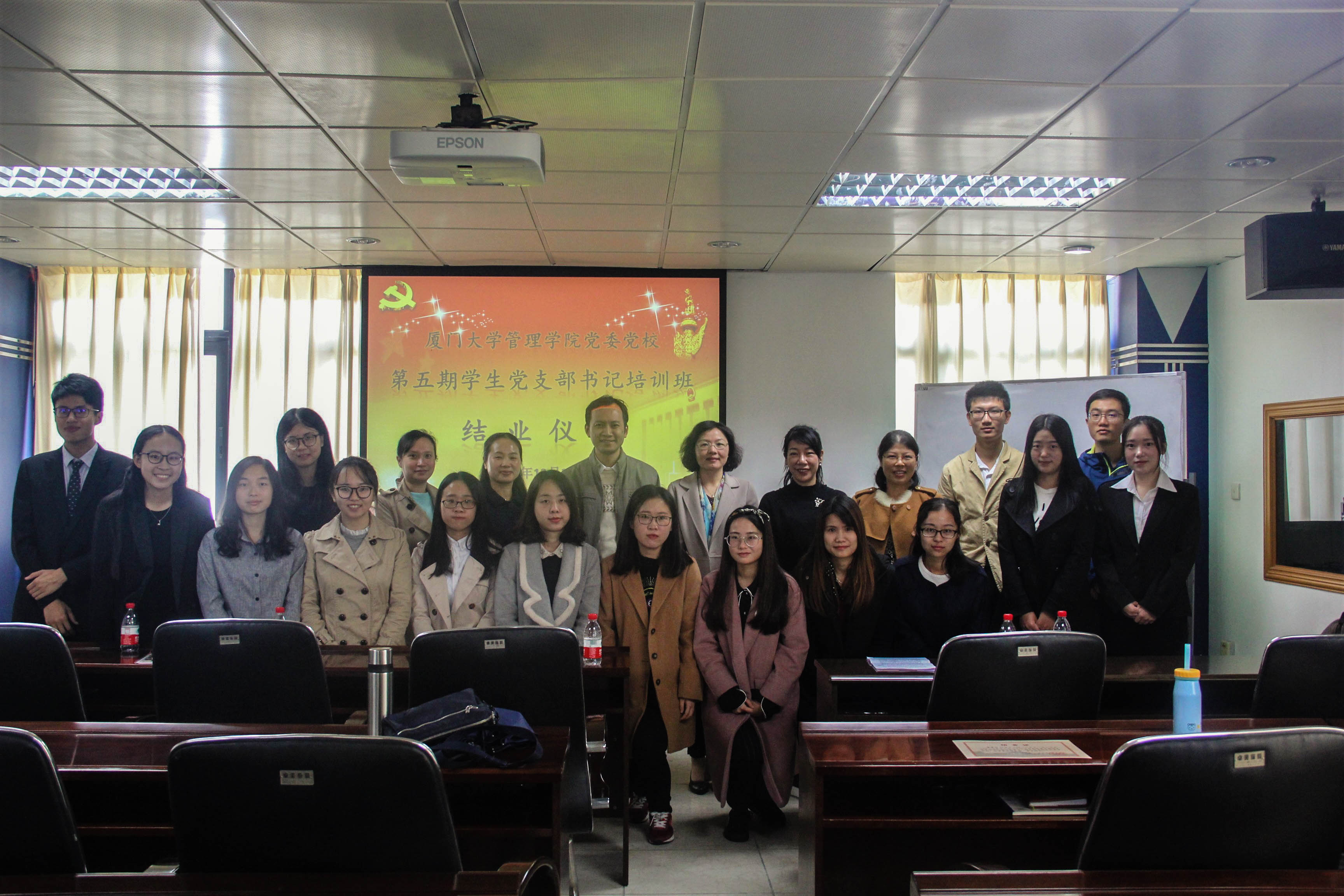 管理学院第五期学生党支部书记培训班结业仪式于12月24日上午在嘉庚二501成功举行。学院党委陈雪玲书记,党委李峰、洪秋霞副书记以及党务秘书蒋超杰、学生工作办公室的老师们出席了本次活动。仪式由团委副书记吴荣梅主持。